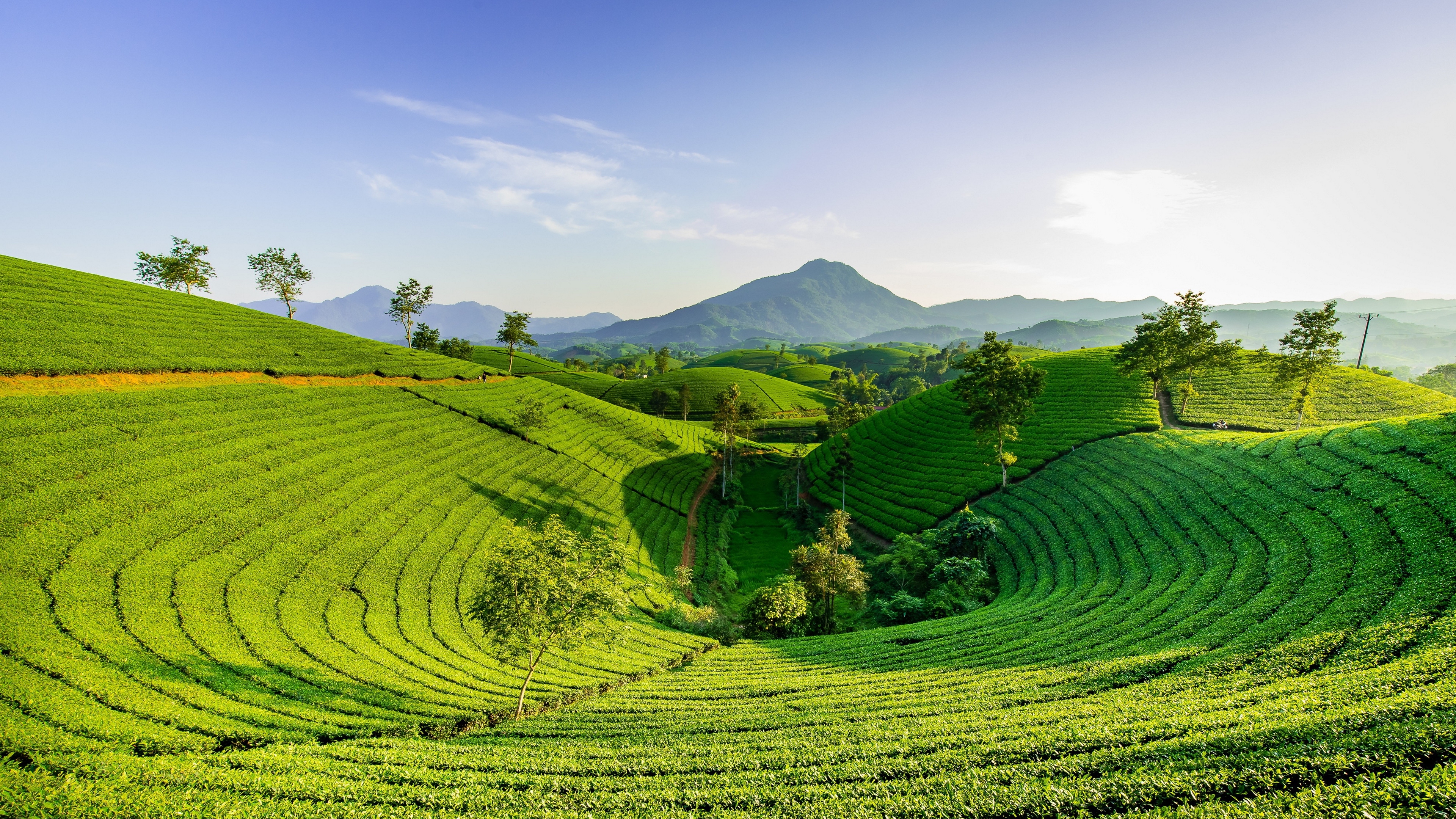 Description: A green field with a mountain in the background and a blue sky in the background with clouds in the sky.