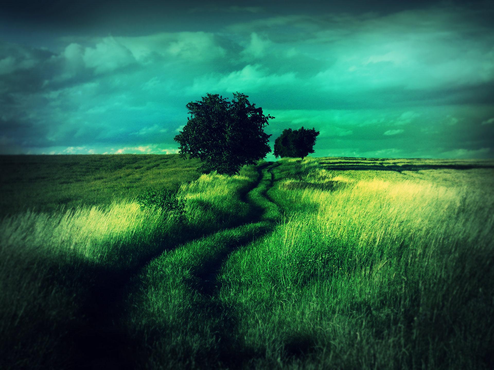 Description: A green field with a tree and a path in the middle of it with a dark sky in the background.