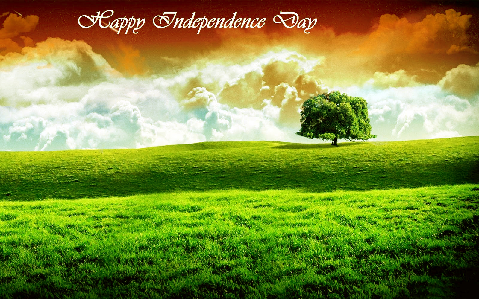 Description: A green field with a tree on top of it and a sky background with clouds above it and a happy shudhununu day message.