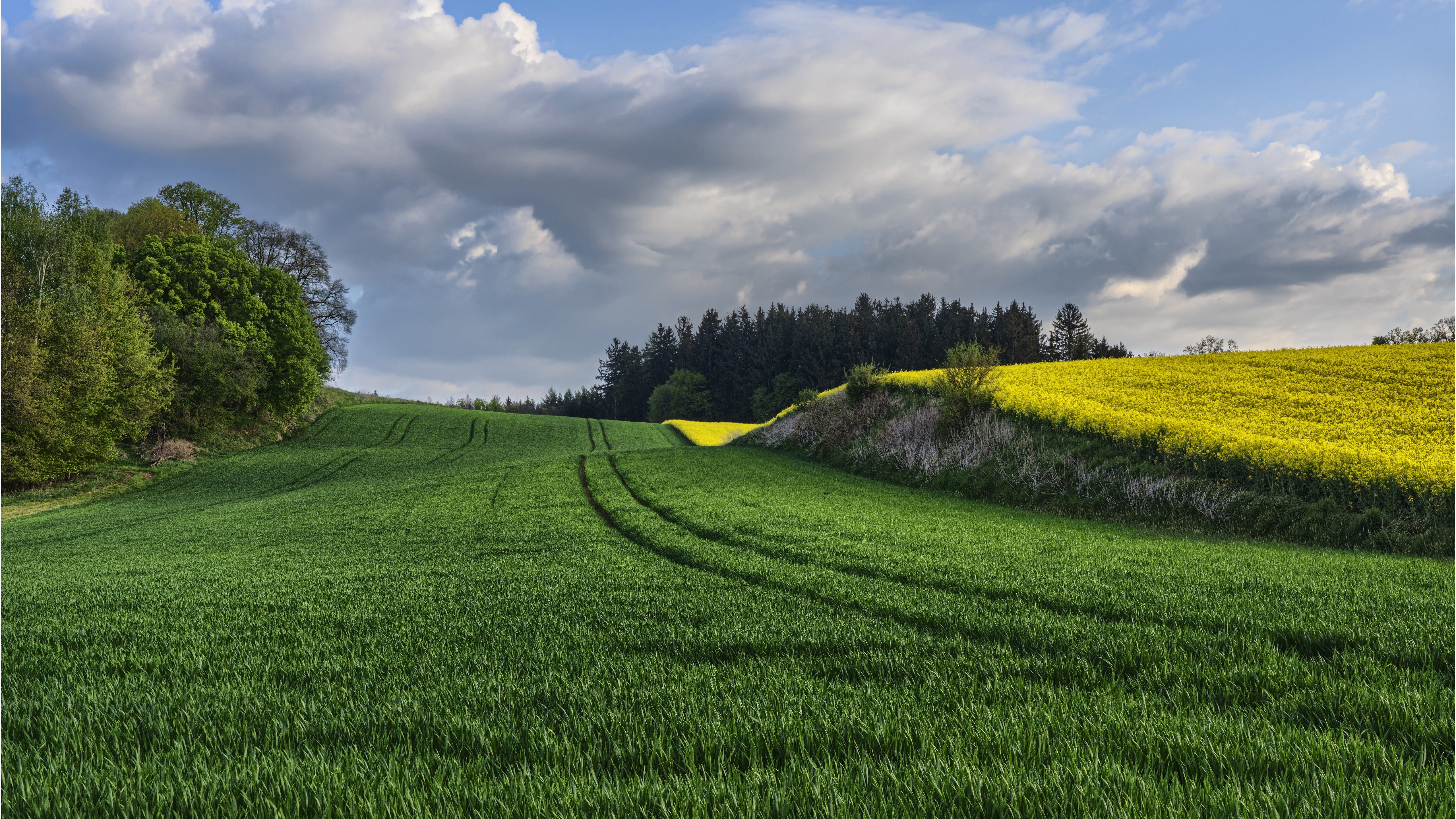 Description: A field of green grass with a line of trees in the distance and a blue sky with clouds above.