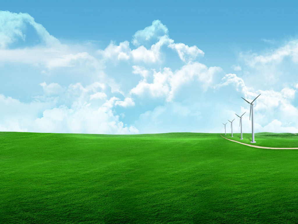 Description: A green field with wind turbines in the distance and a blue sky with clouds above it and a white road running through it.