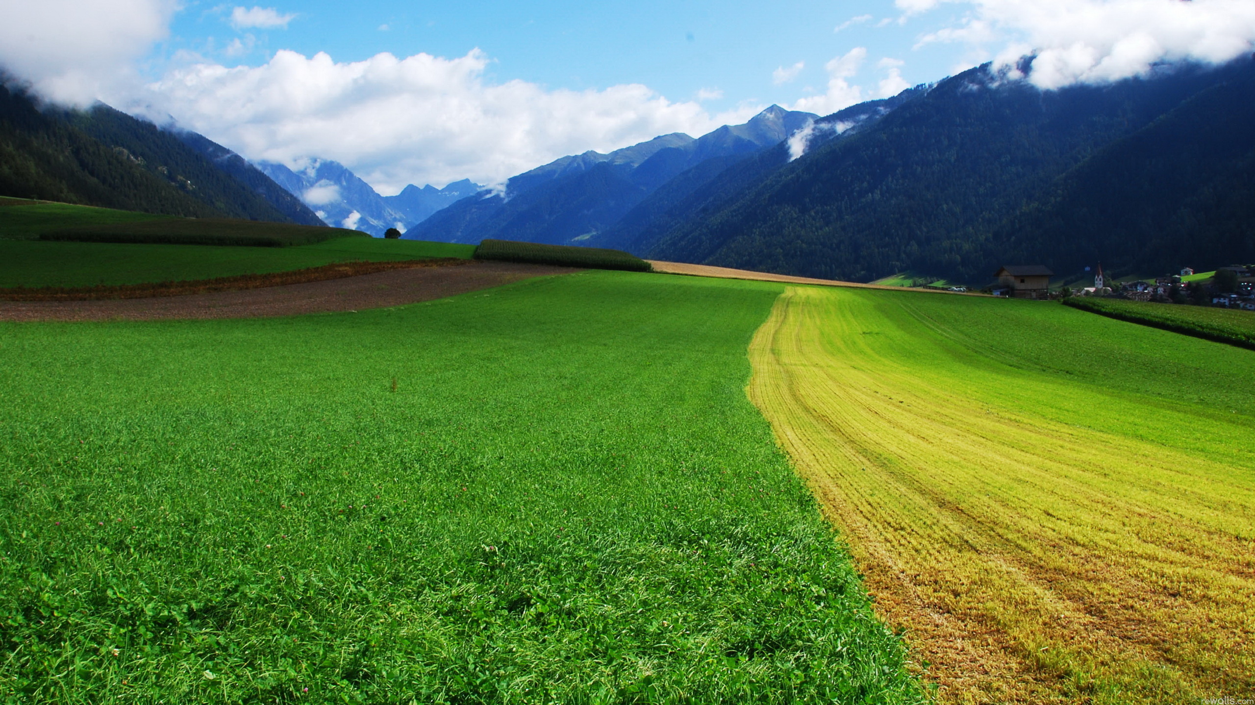Description: A green field with a yellow strip in the middle of it and a mountain range in the background with clouds.