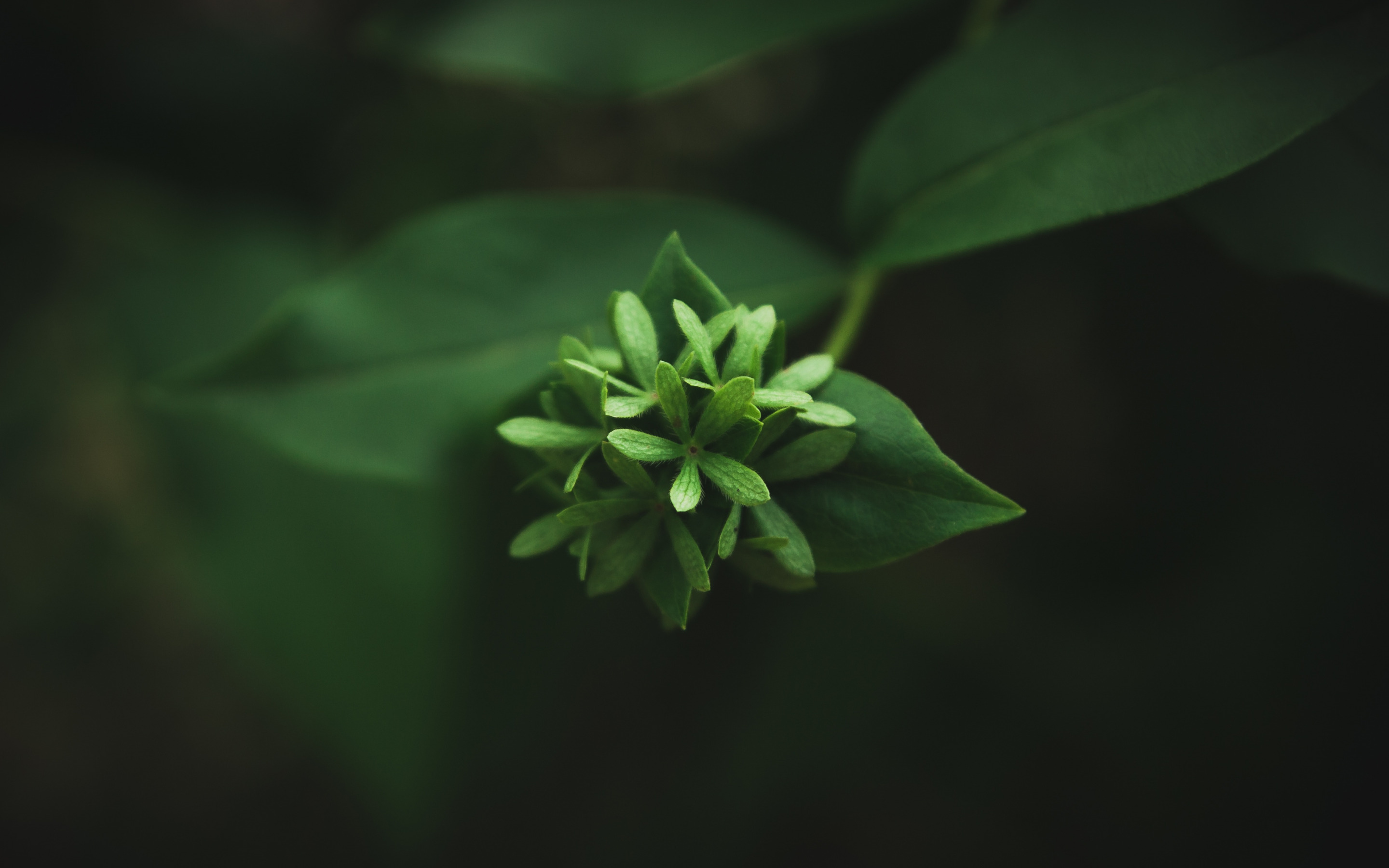 Description: A close up of a green flower with leaves in the background and a blurry background behind it.
