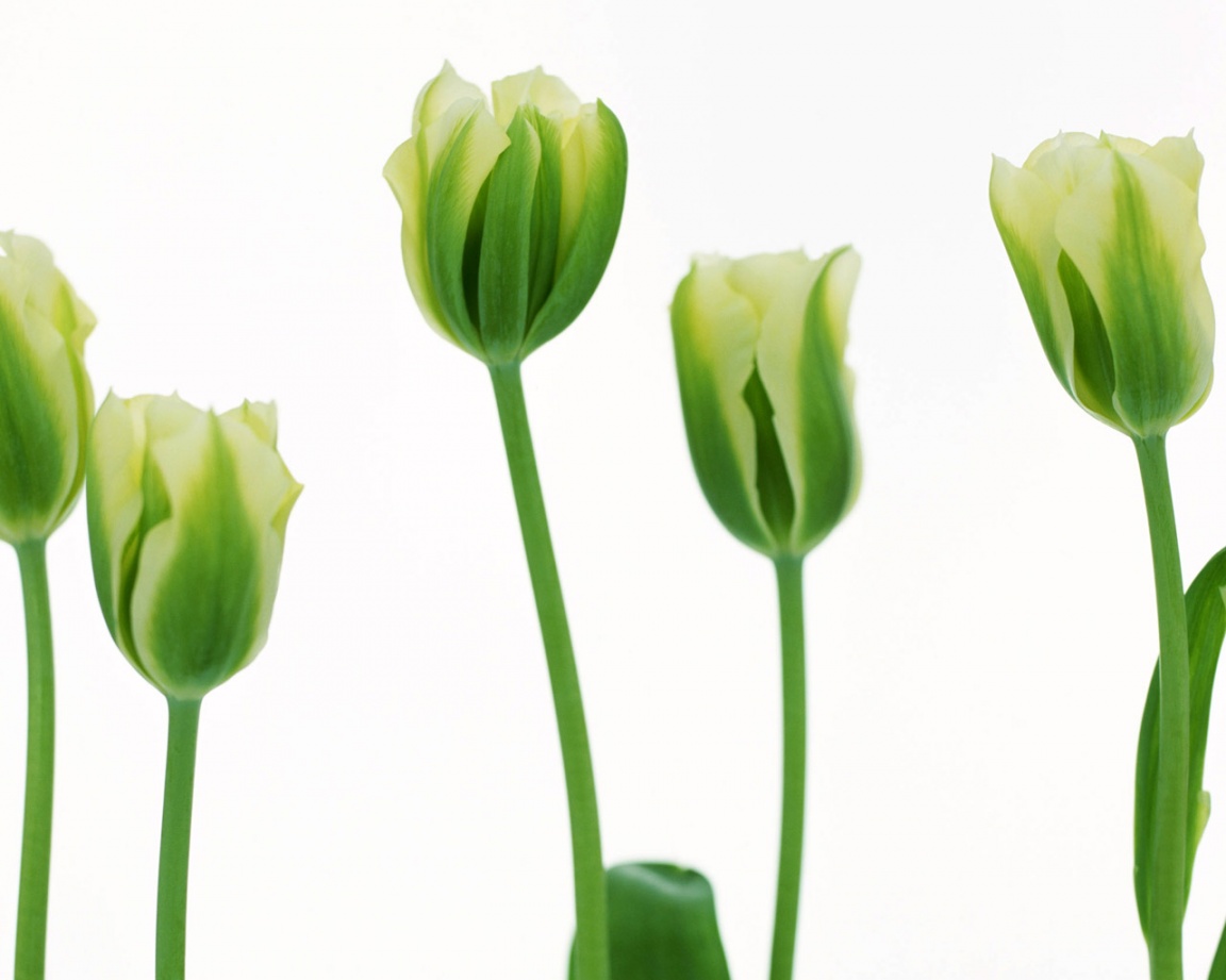 Description: A group of green flowers with a white background behind them and a white wall behind them with a white background.