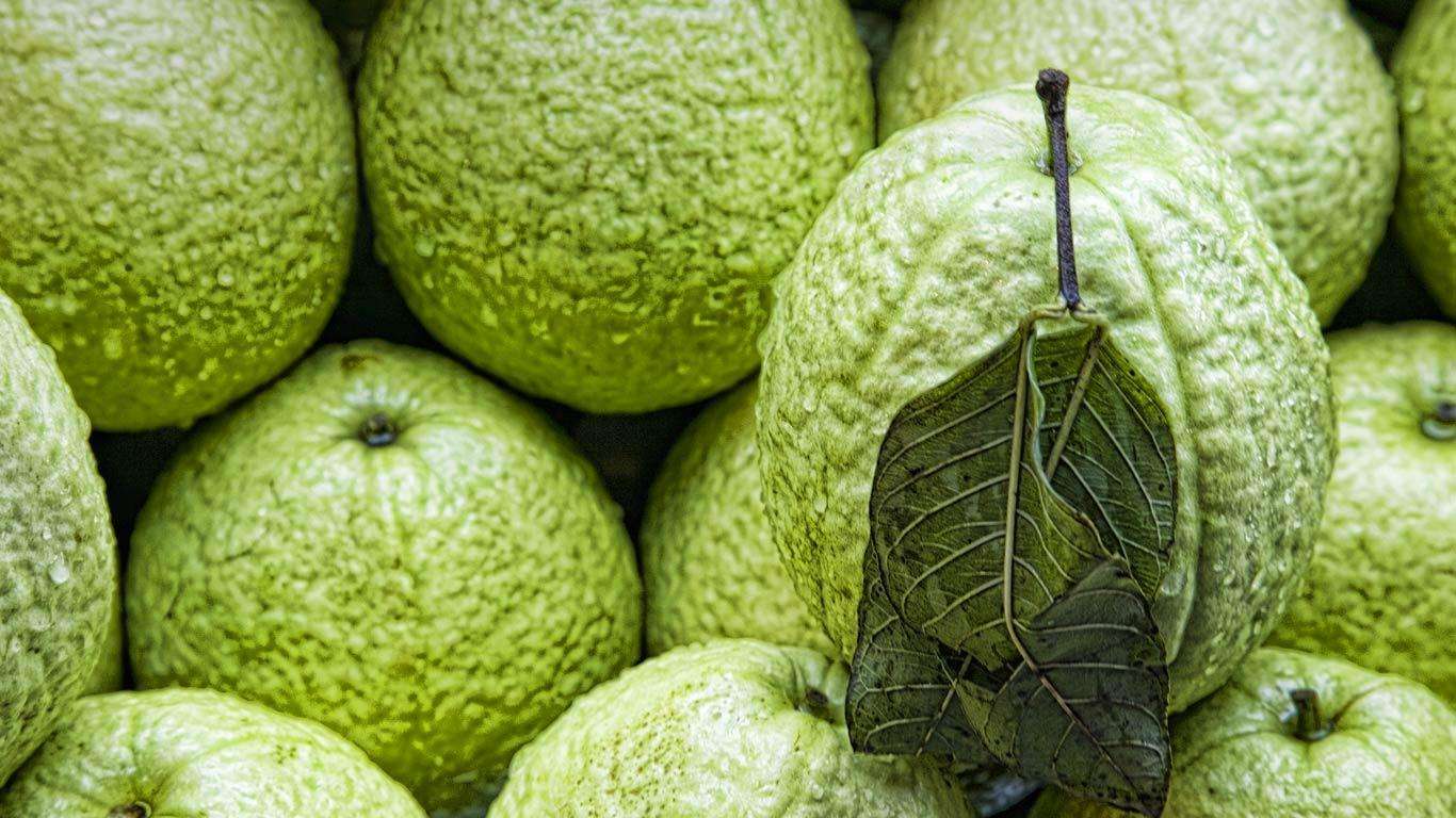 Description: A pile of green fruit with a leaf on top of it's head and a leaf on the top of the fruit.