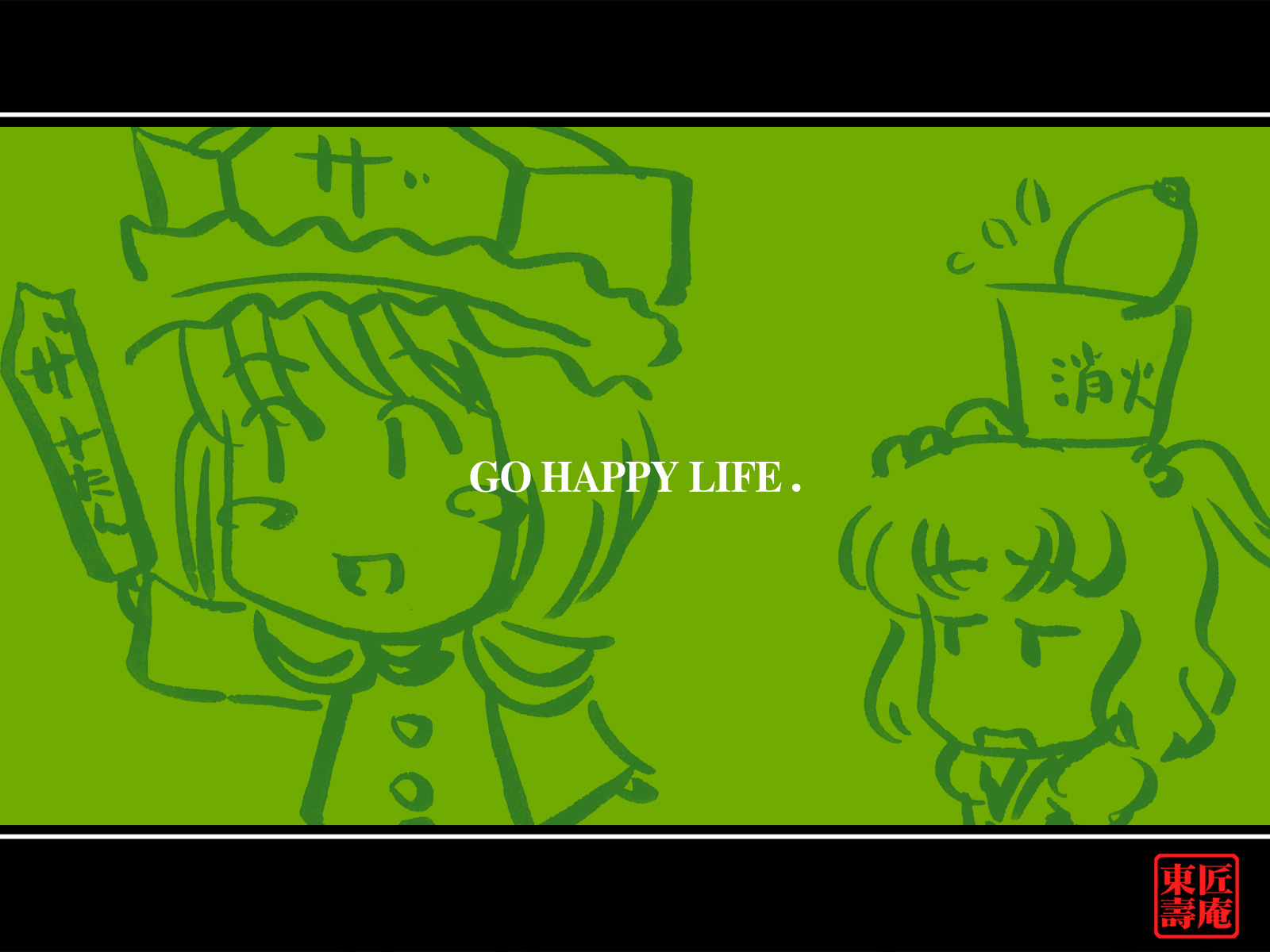 Description: A green background with a drawing of a girl and a boy with a hat and a cross on it.