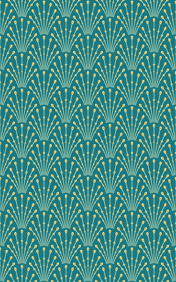 Description: A green and gold wallpaper with a fan pattern on it's side.