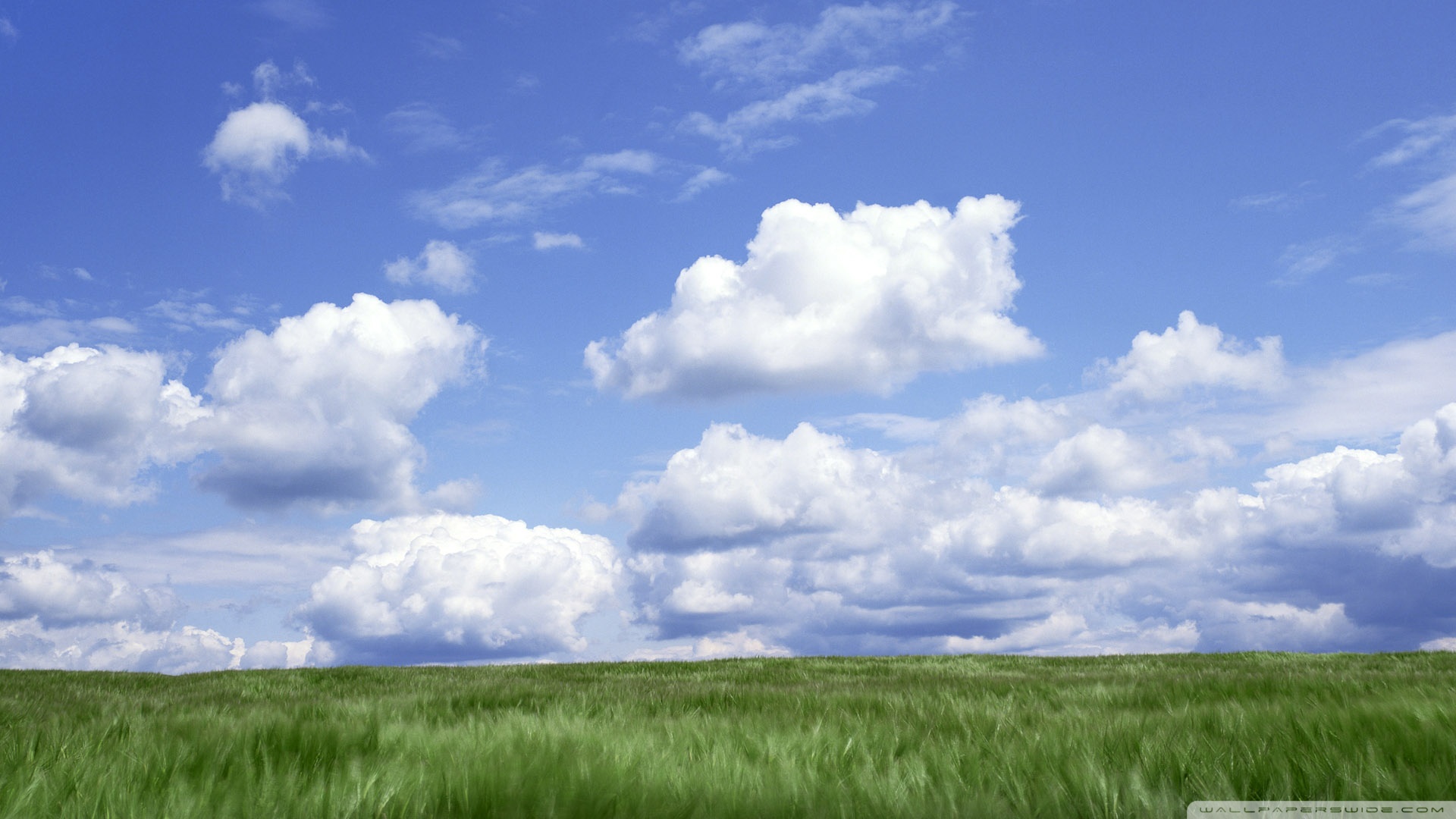 Description: A field of green grass under a blue sky with clouds in the background and a horse in the foreground.