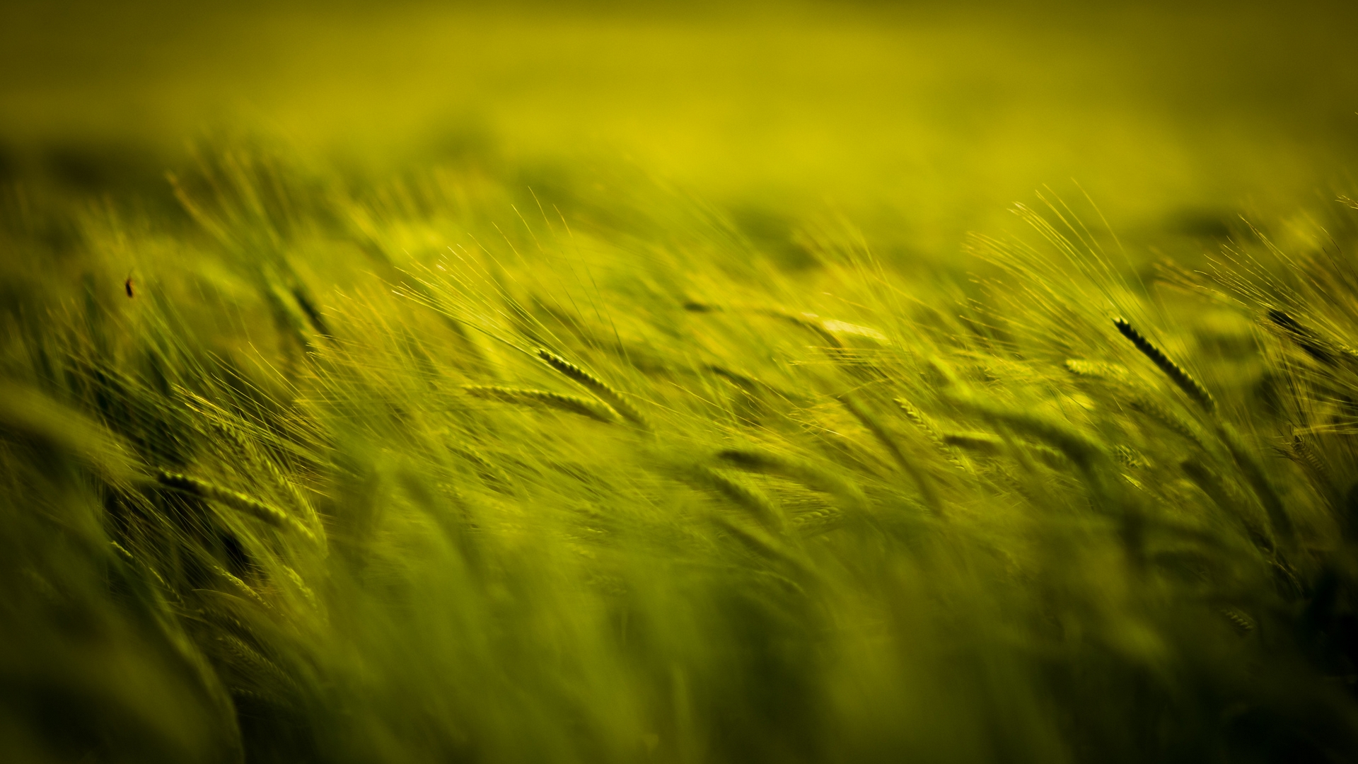 Description: A field of green grass with a blurry background of the grass is green and yellow and has a small amount of grass in it.