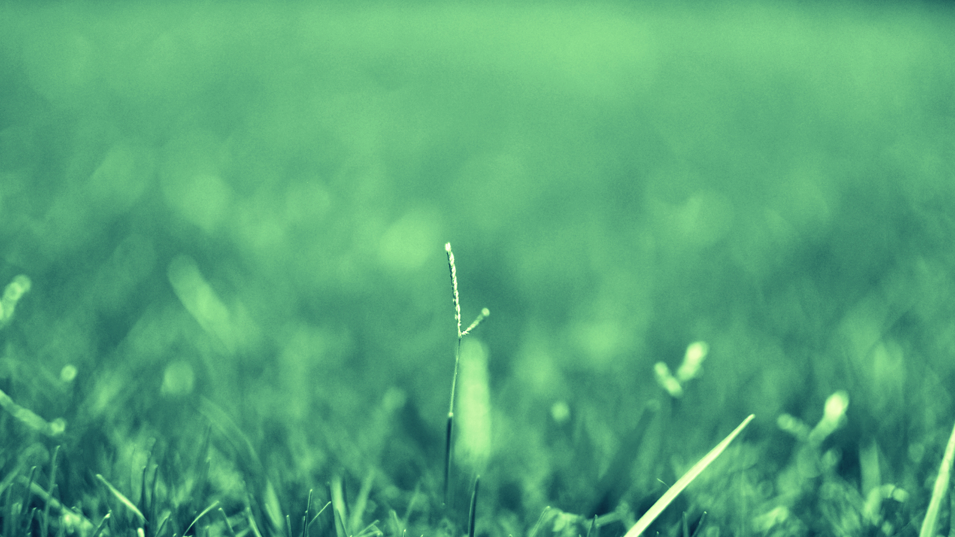 Description: A green grass field with a single plant sticking out of the grass and a blurry background of the grass.