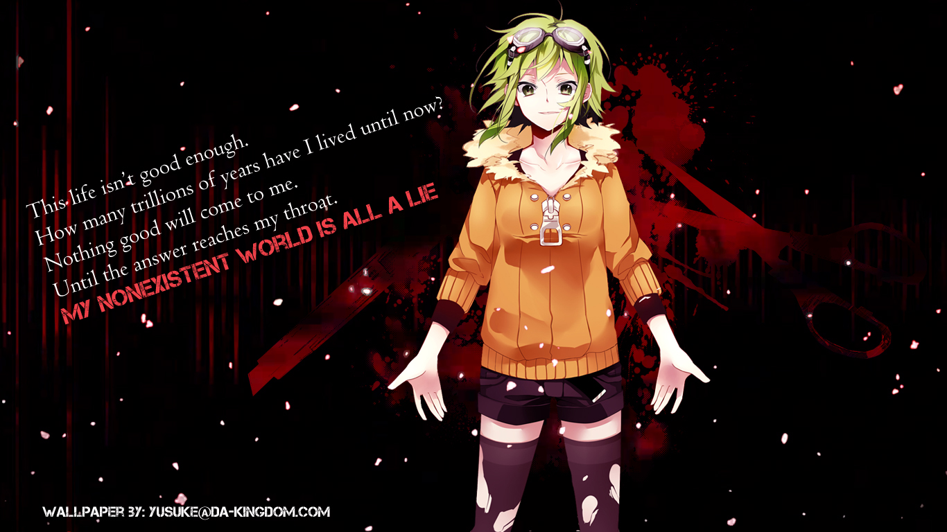 Description: A girl with green hair and a brown shirt is standing in front of a black background with a red and white quote.