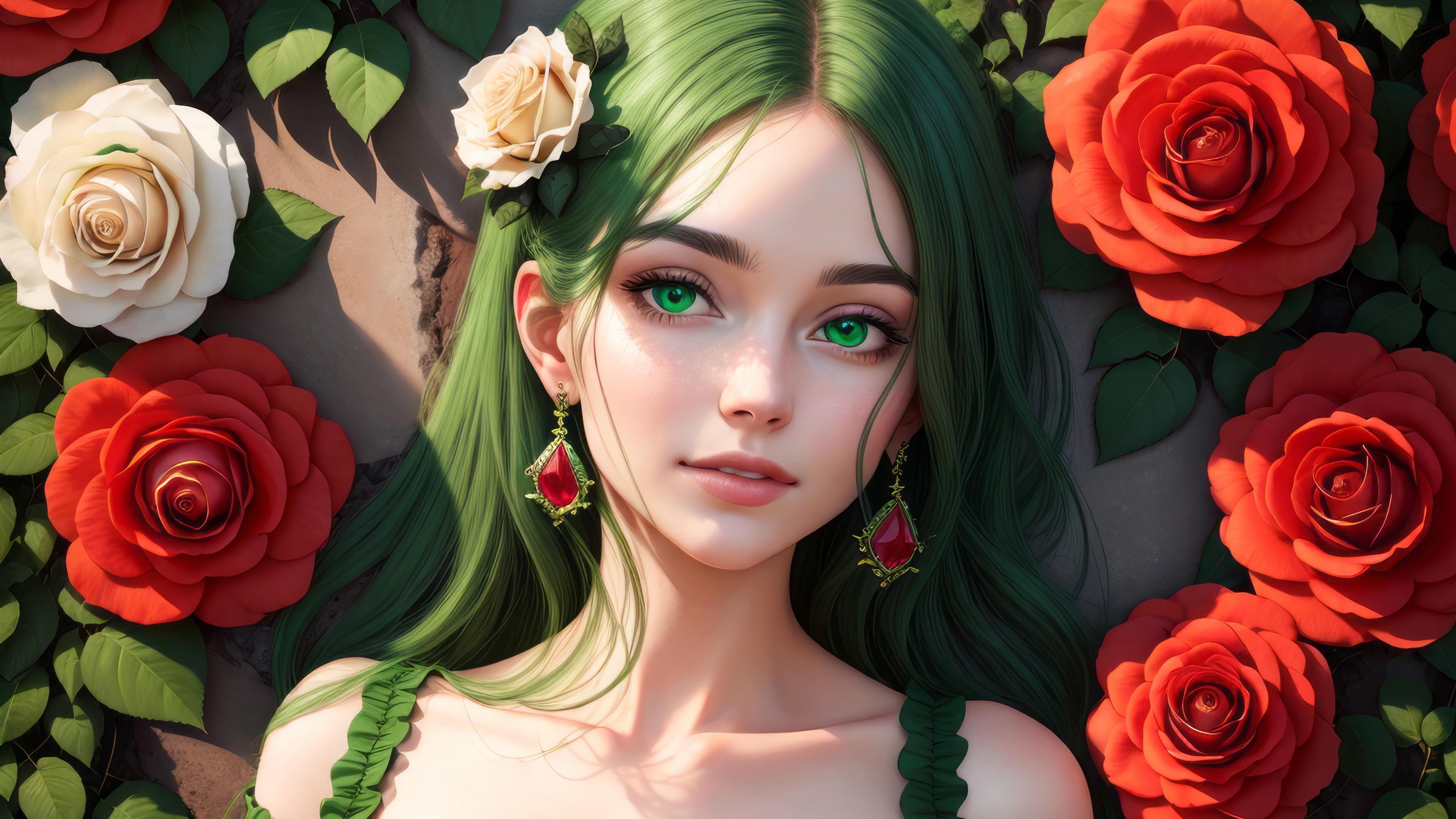 Description: A woman with green hair and green eyes surrounded by roses and roses on a wall of flowers and leaves.