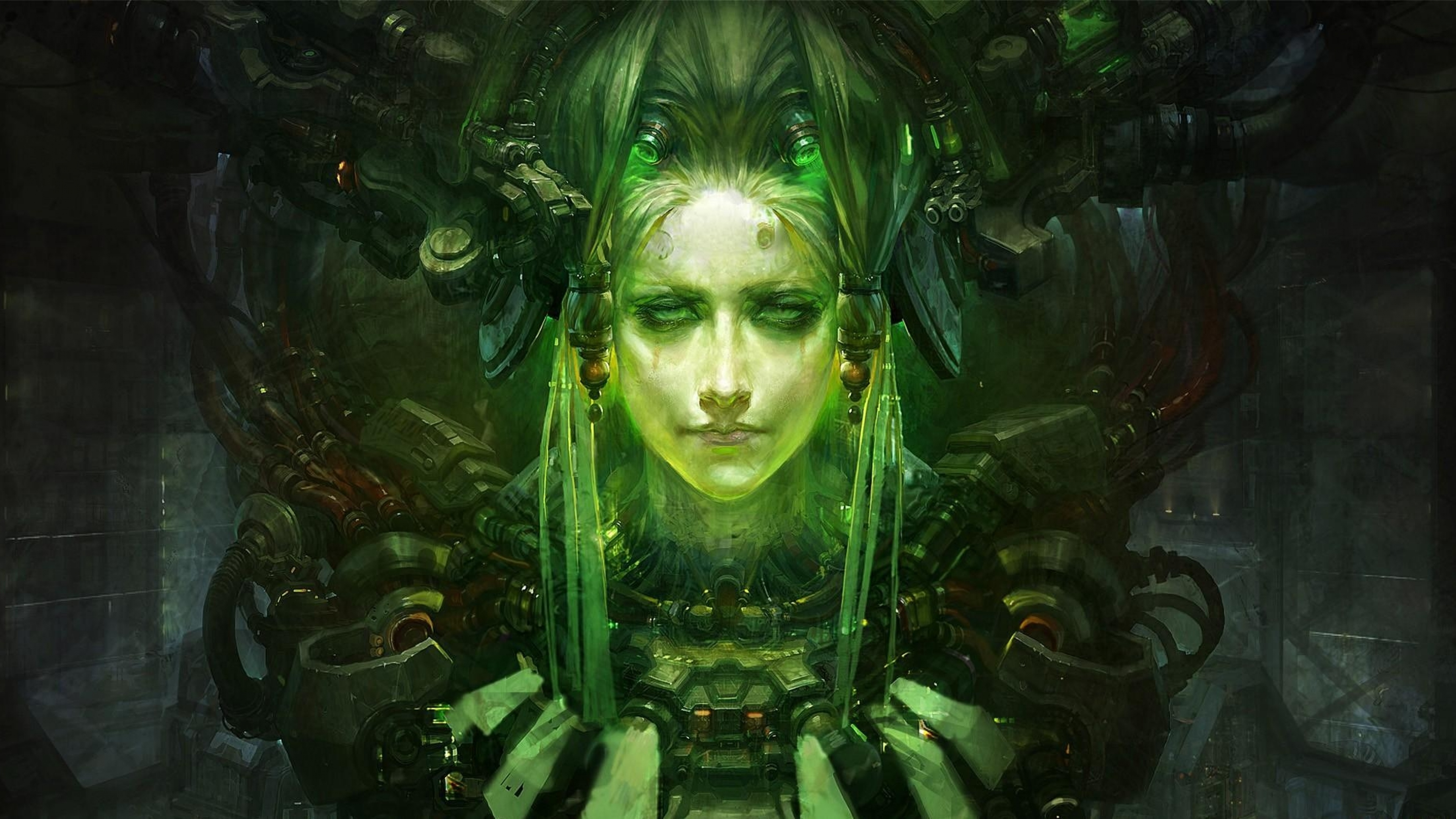 Description: A woman with green hair and a green face with a strange headpiece on her head and a green background.