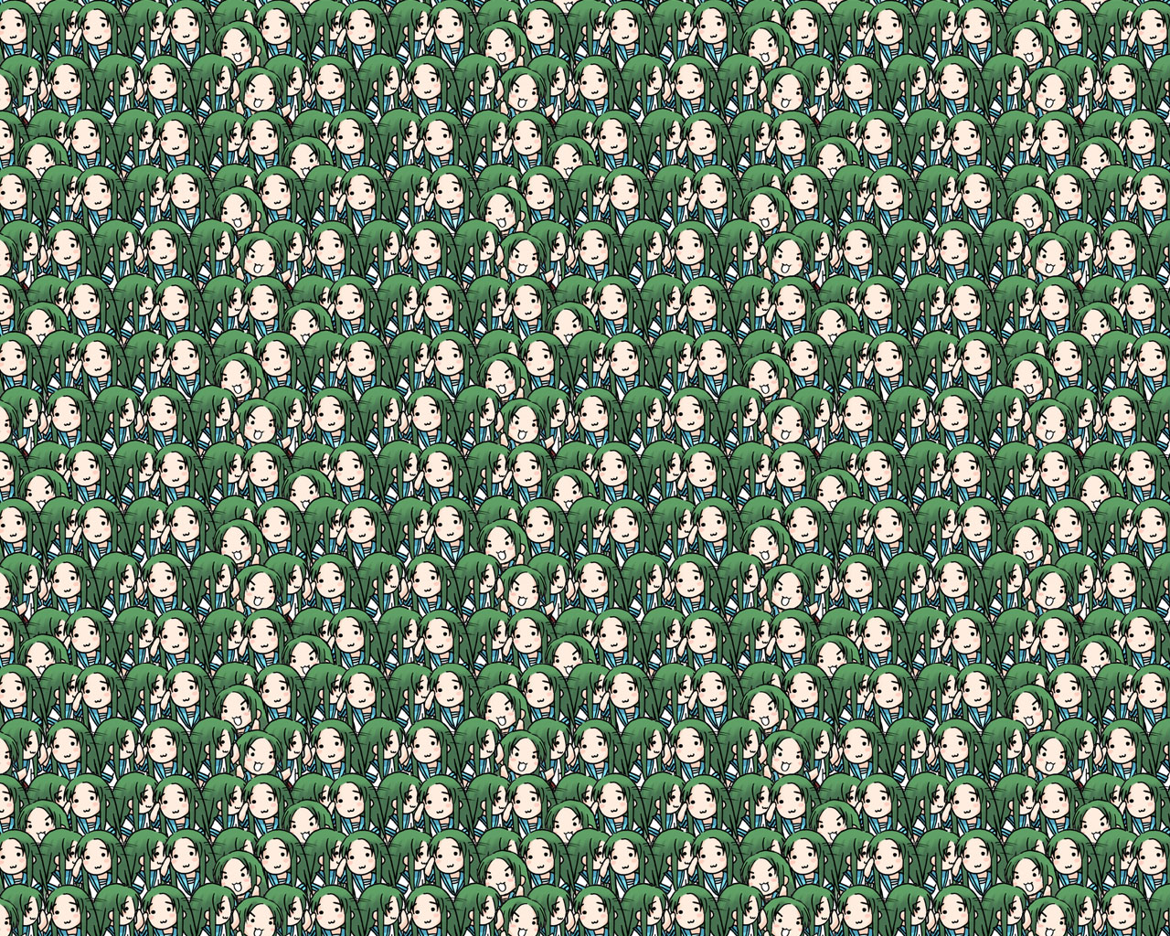 Description: A group of people with green hair and green eyes are in a pattern of green leaves and heads of people.