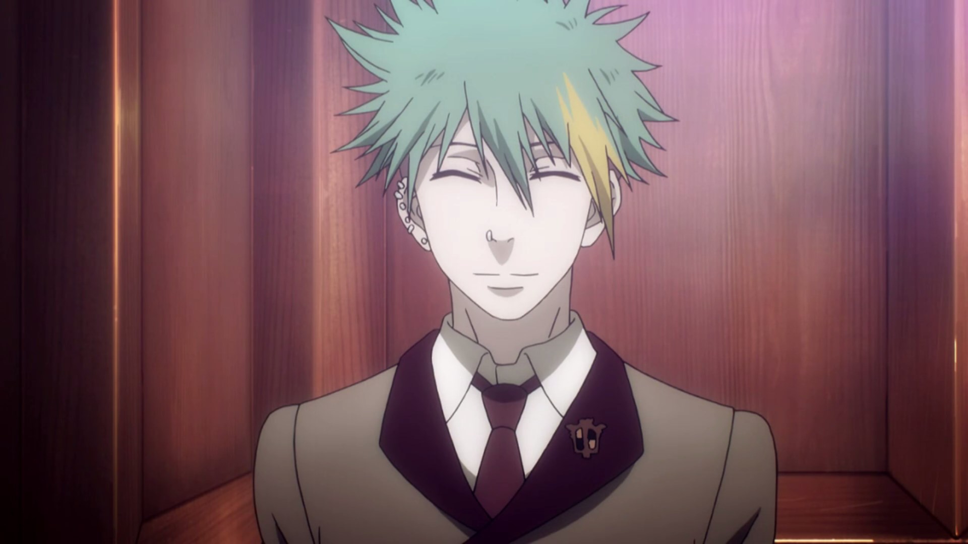 Description: A man with green hair and a tie in a room with wooden walls and a door with a purple light.