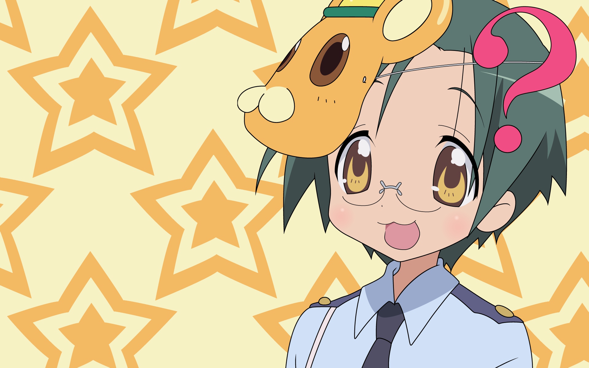 Description: A woman with a tie and a cow on her head with stars in the background and a yellow background.