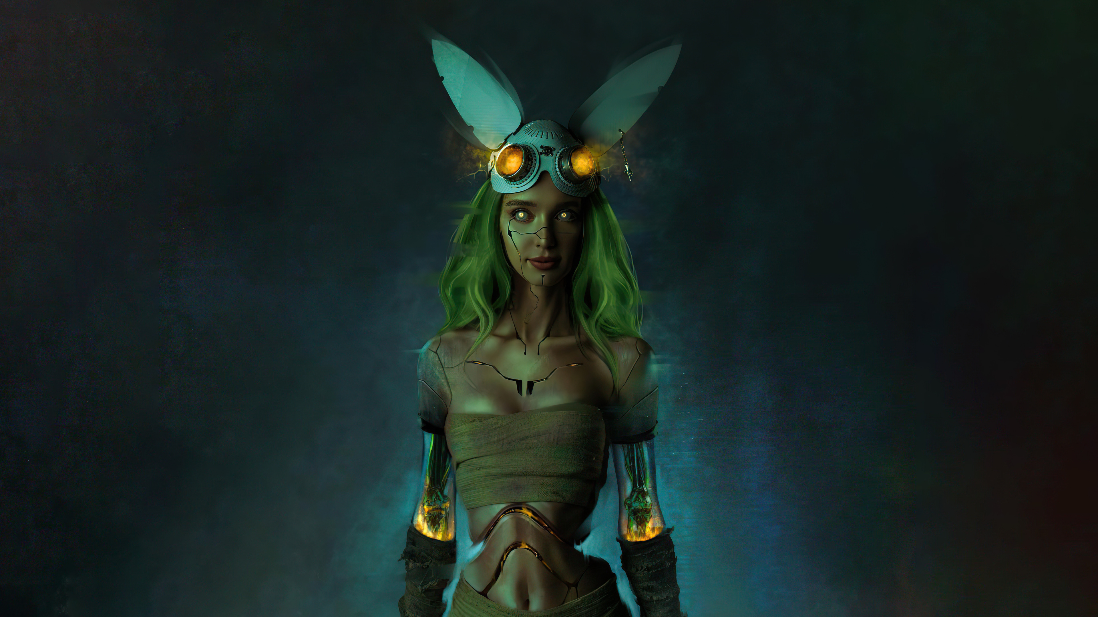 Description: A woman with green hair and yellow eyes wearing a costume with glowing eyes and a green wig and gloves.
