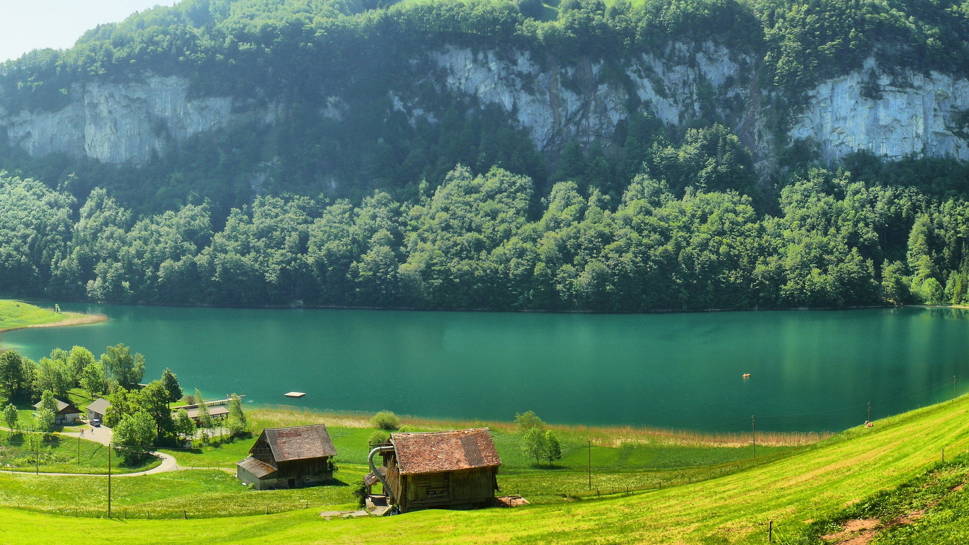 Description: A green field with a lake and a mountain in the background with a few houses on it and a few trees.
