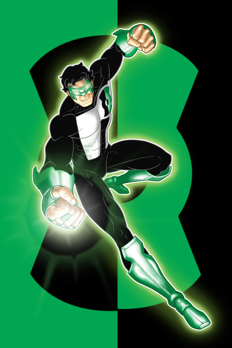 Description: A green lantern is flying through the air with his hands in the air and his legs out.