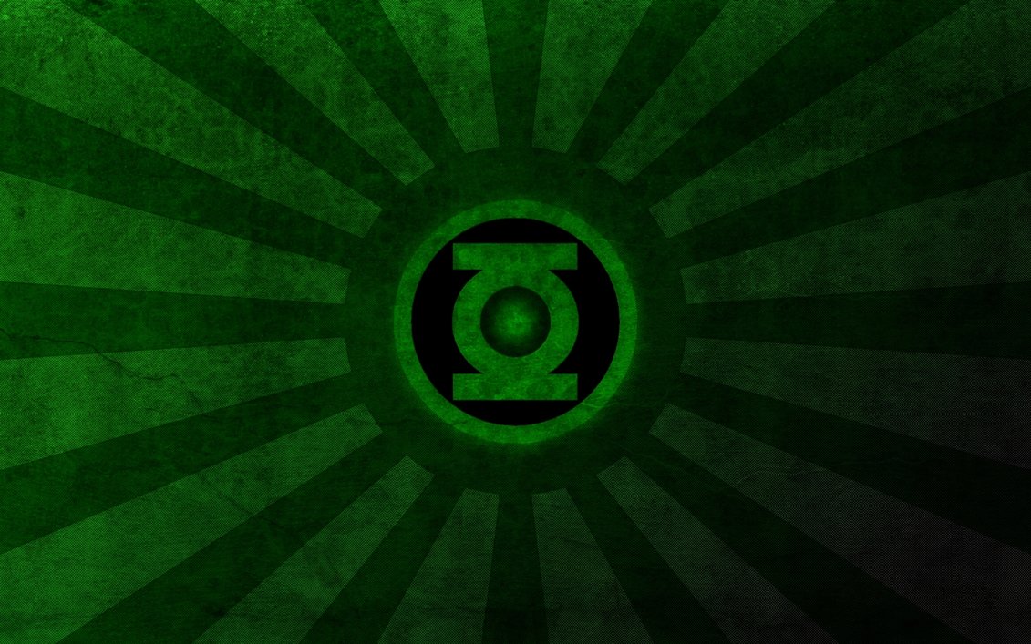 Description: A green lantern logo on a green background with rays around it and a black dot in the center of the image.
