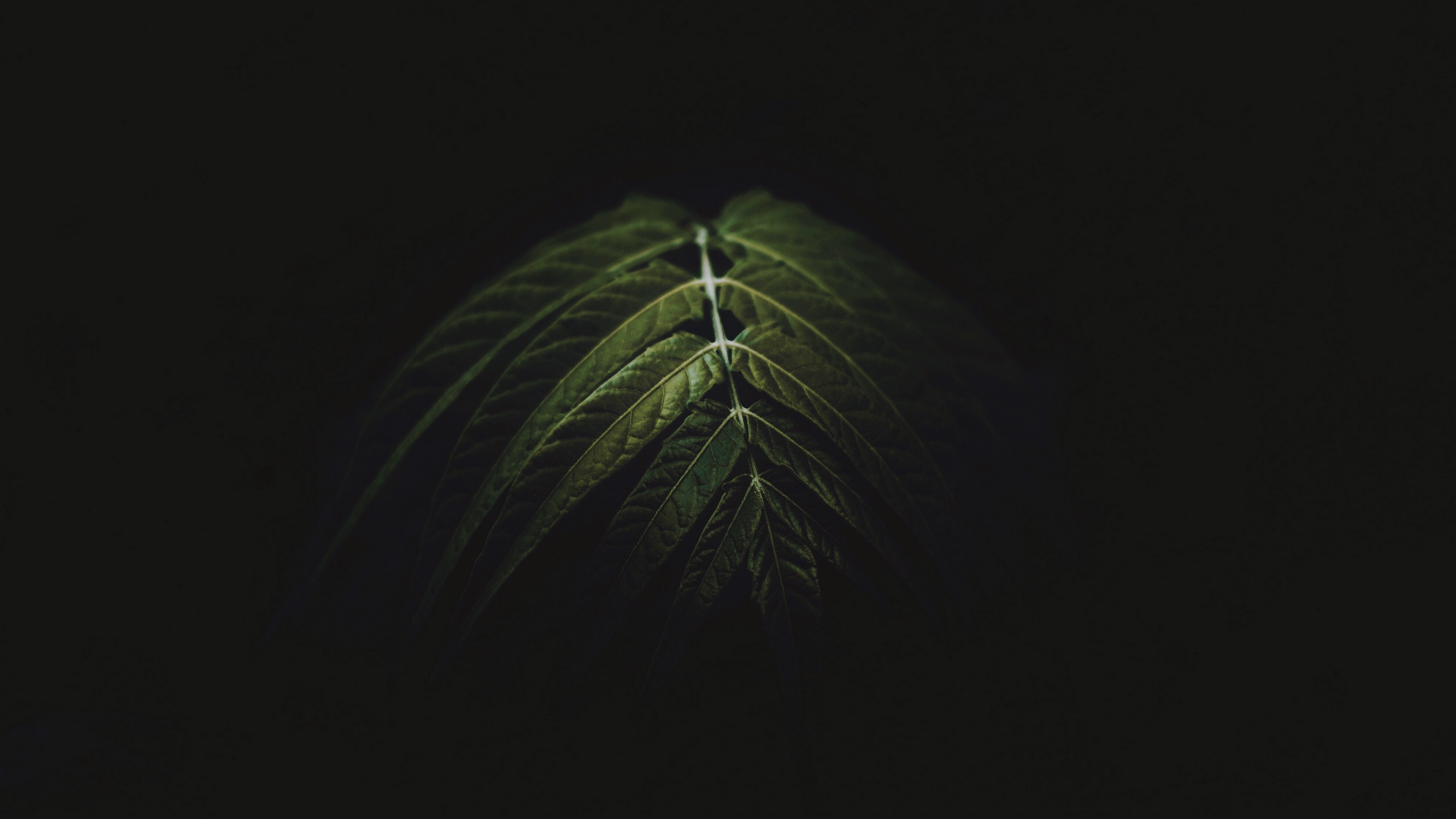 Description: A green leaf is shown in the dark with a black background and a light shining on it's side.