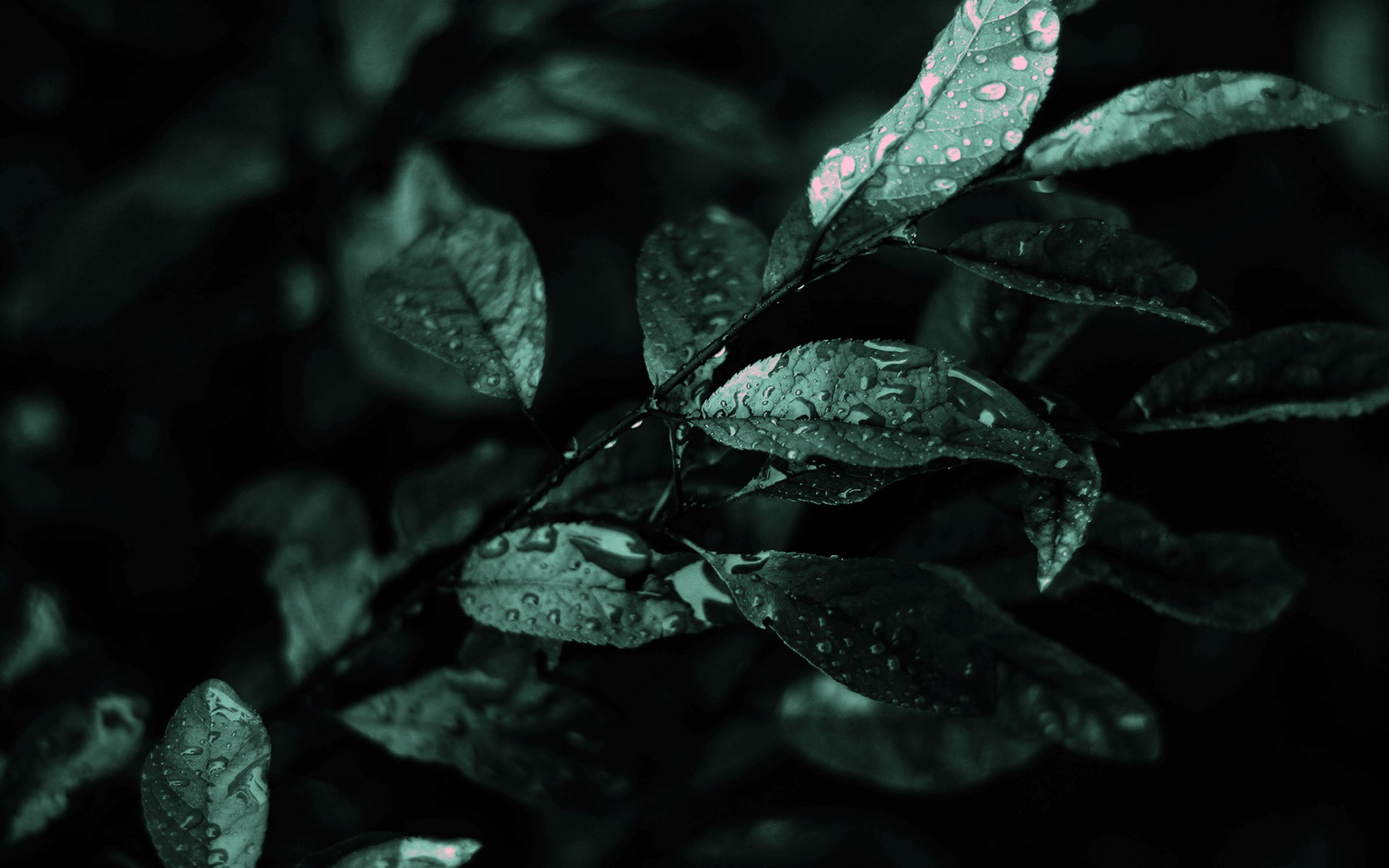 Description: A green leaf with water droplets on it's leaves and a black background with a white spot on the leaves.