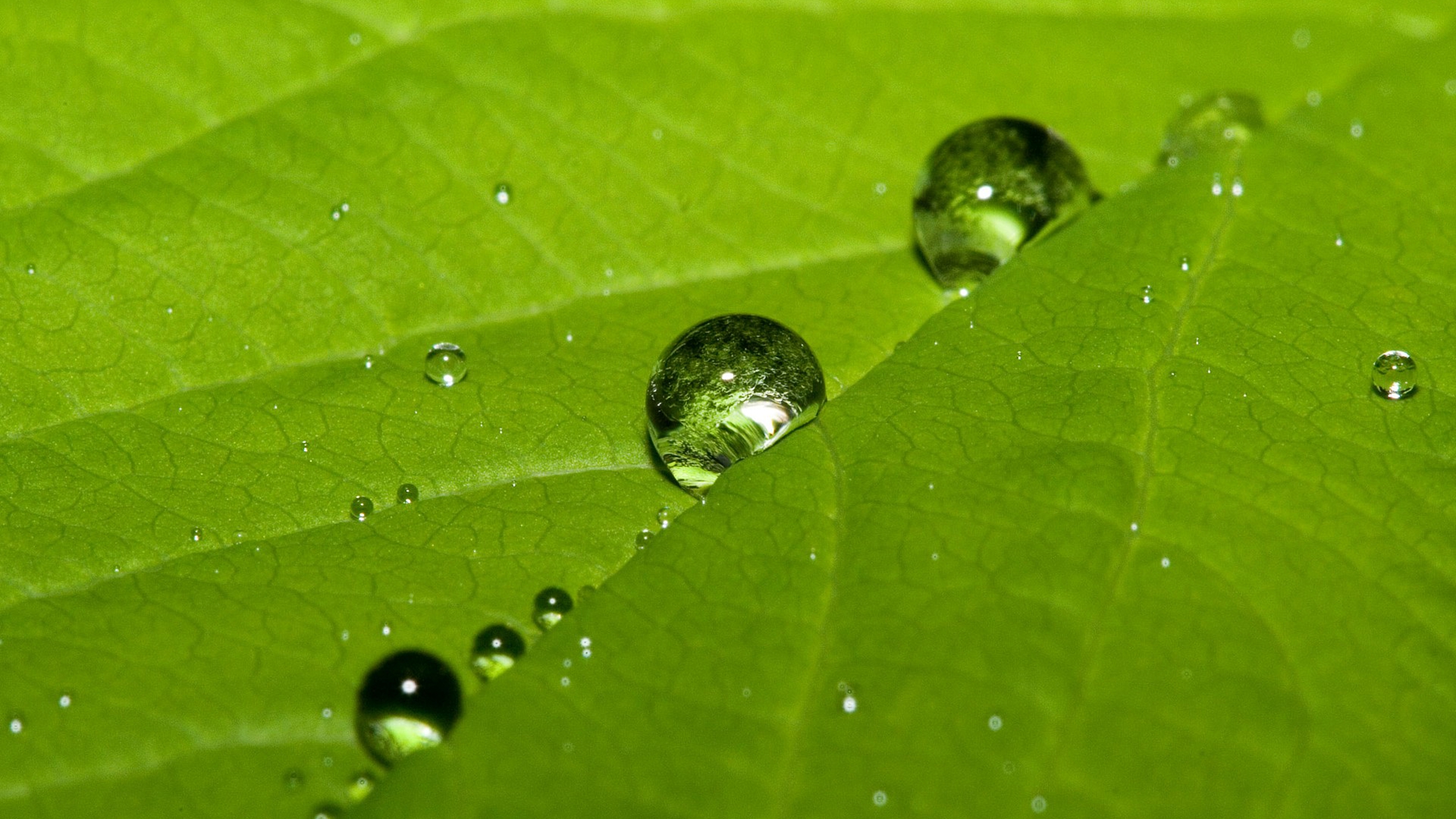 Description: A green leaf with water droplets on it's leaves and a green background with a few drops of water on the leaves.
