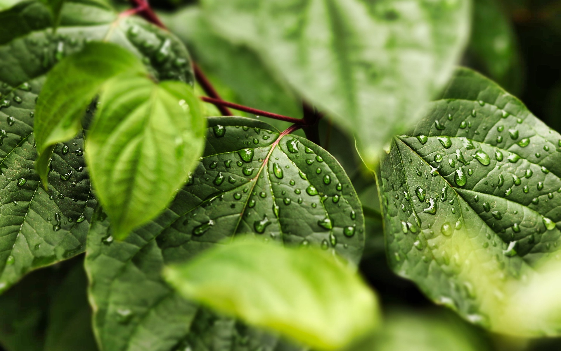 Description: A close up of a green leaf with water drops on it's leaves and leaves are in the background.