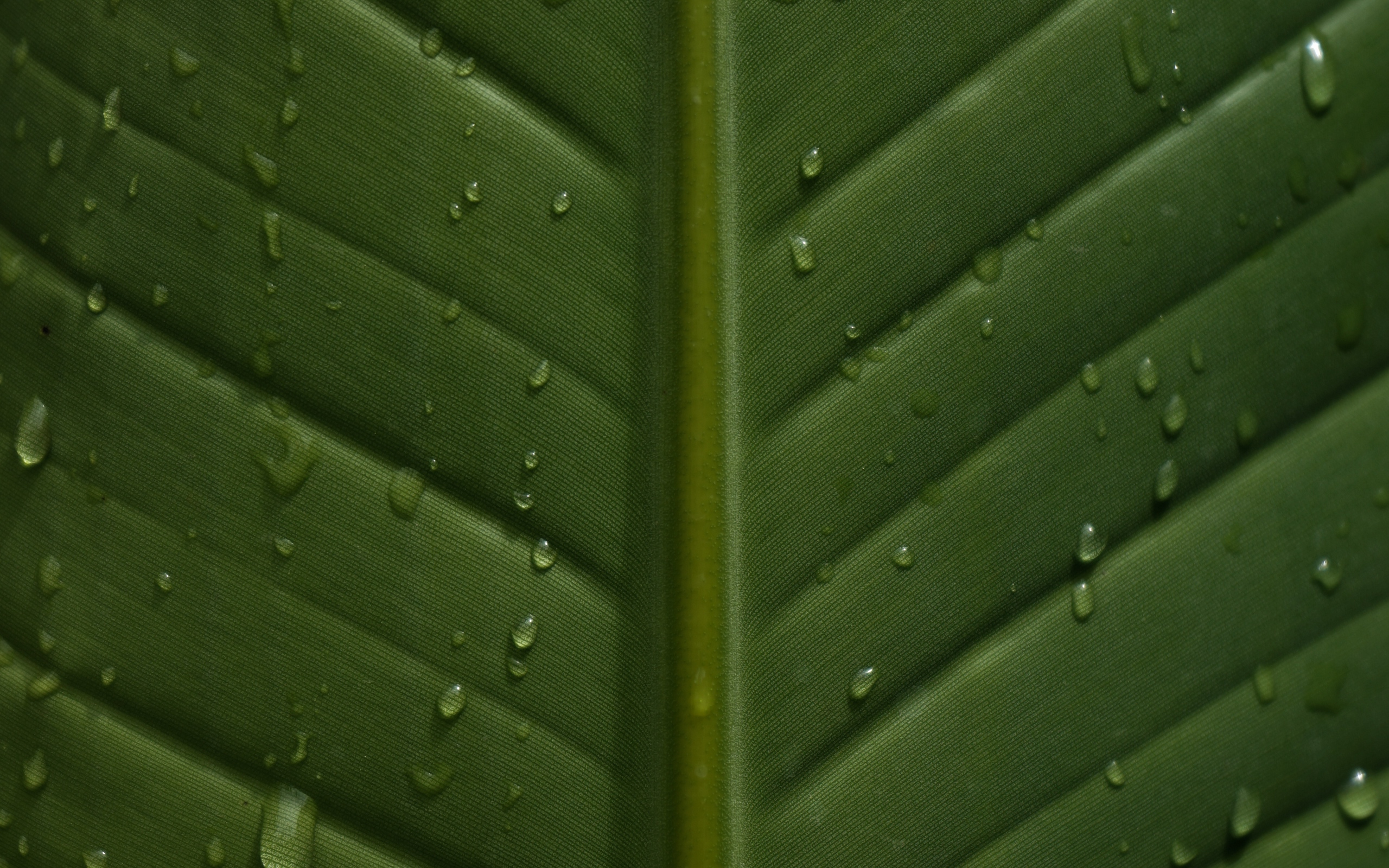 Description: A close up of a green leaf with water drops on it's leaves surface and a green background.