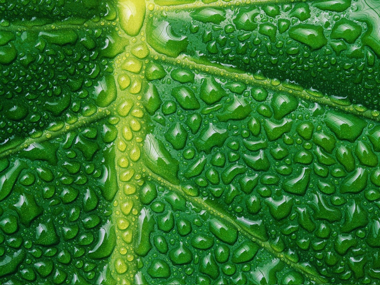 Description: A close up of a green leaf with water drops on it's surface and a yellow center in the center.