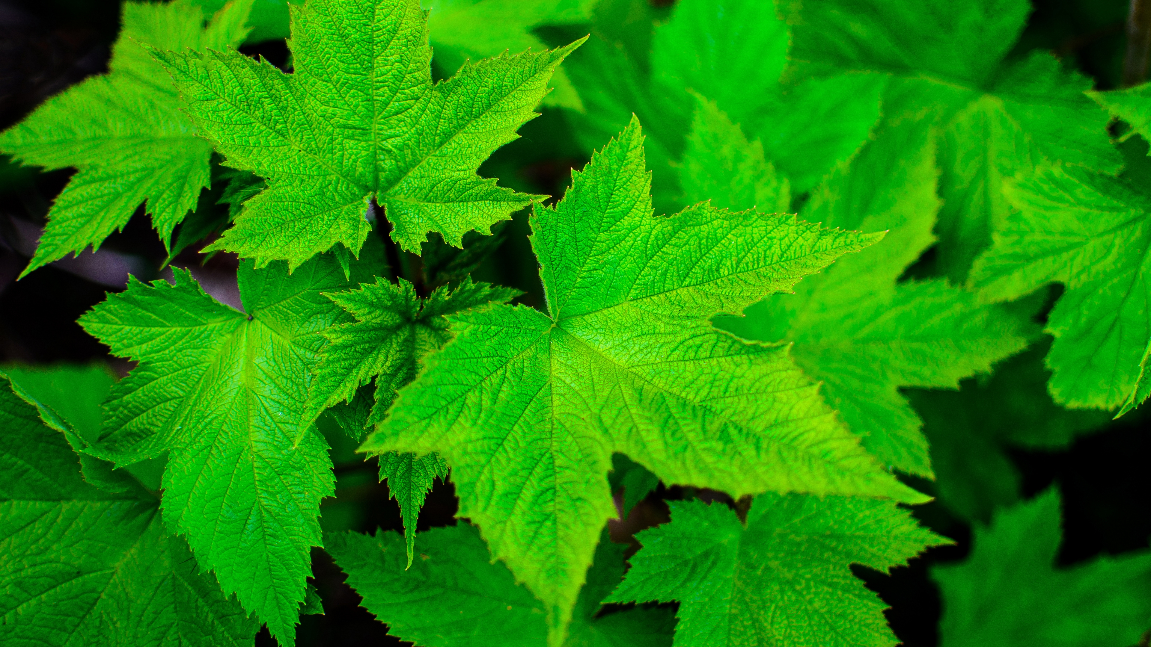 Description: A close up of a green leafy plant with lots of leaves on it's sides and a black background.