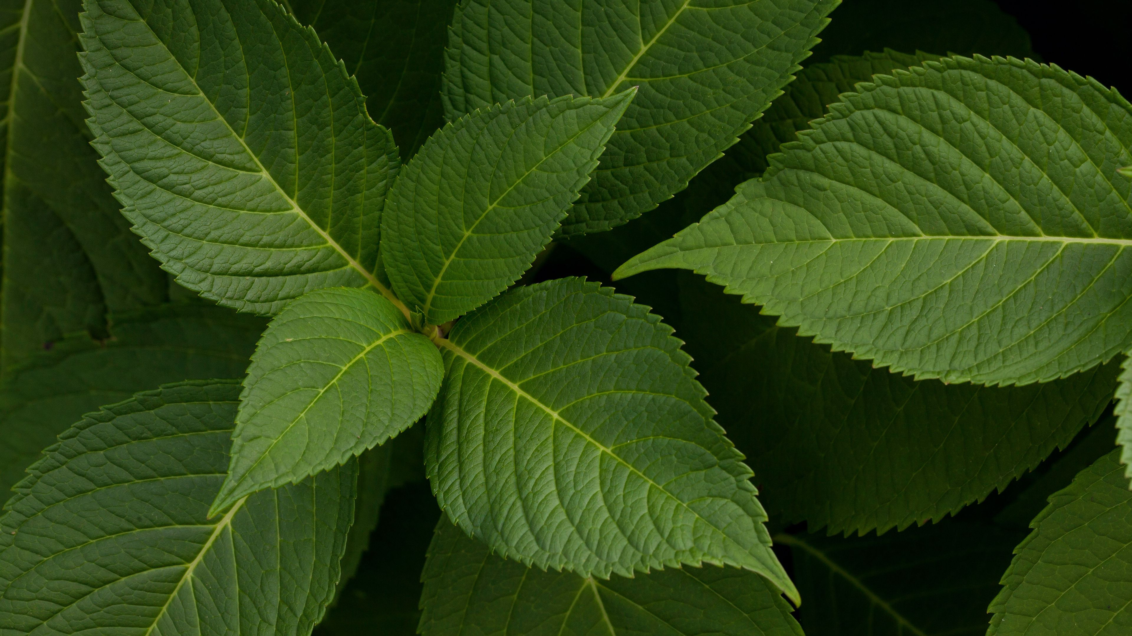 Description: A close up of a green leafy plant with lots of leaves on it's sides and a black background.