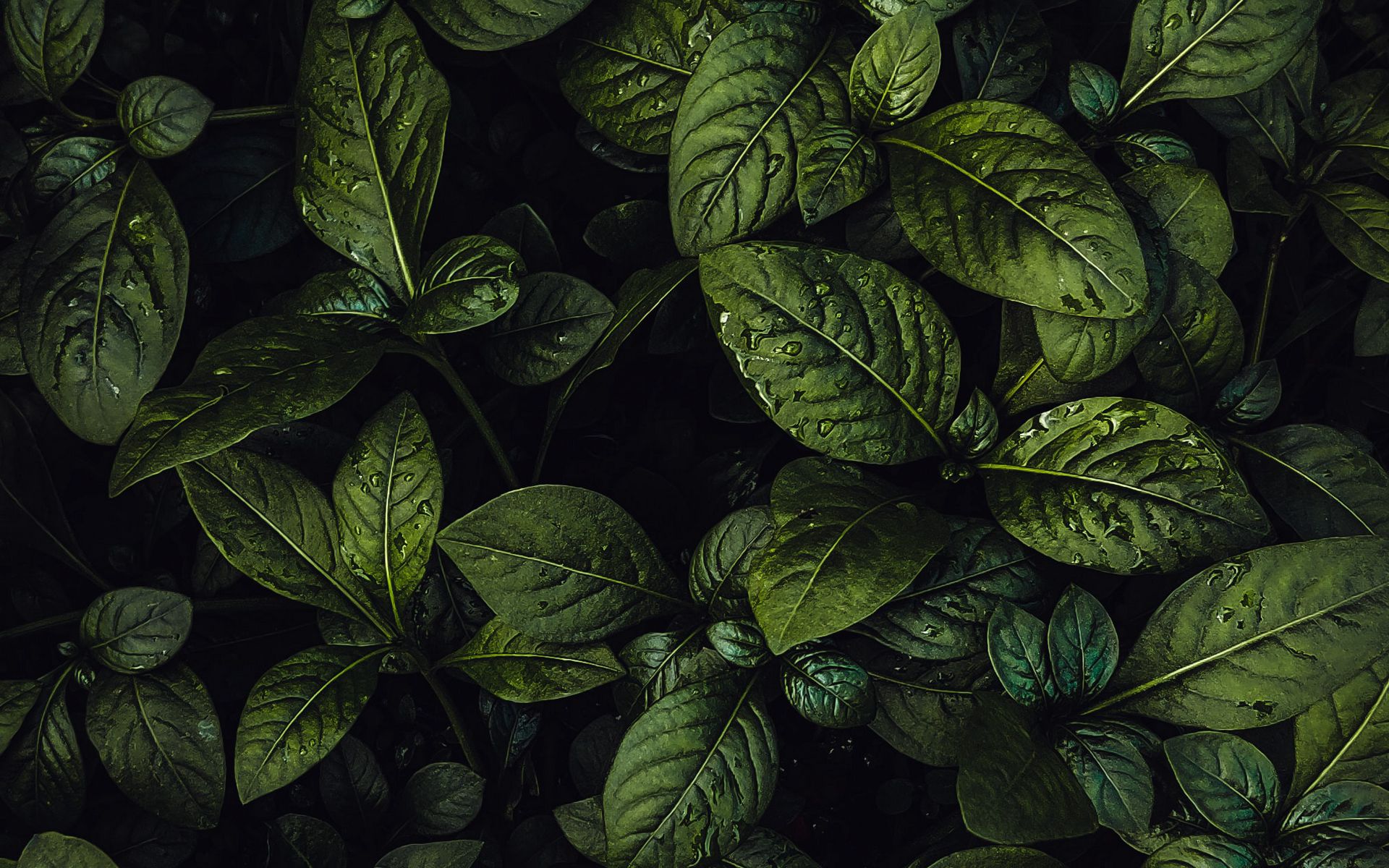 Description: A bunch of green leaves with water droplets on them.