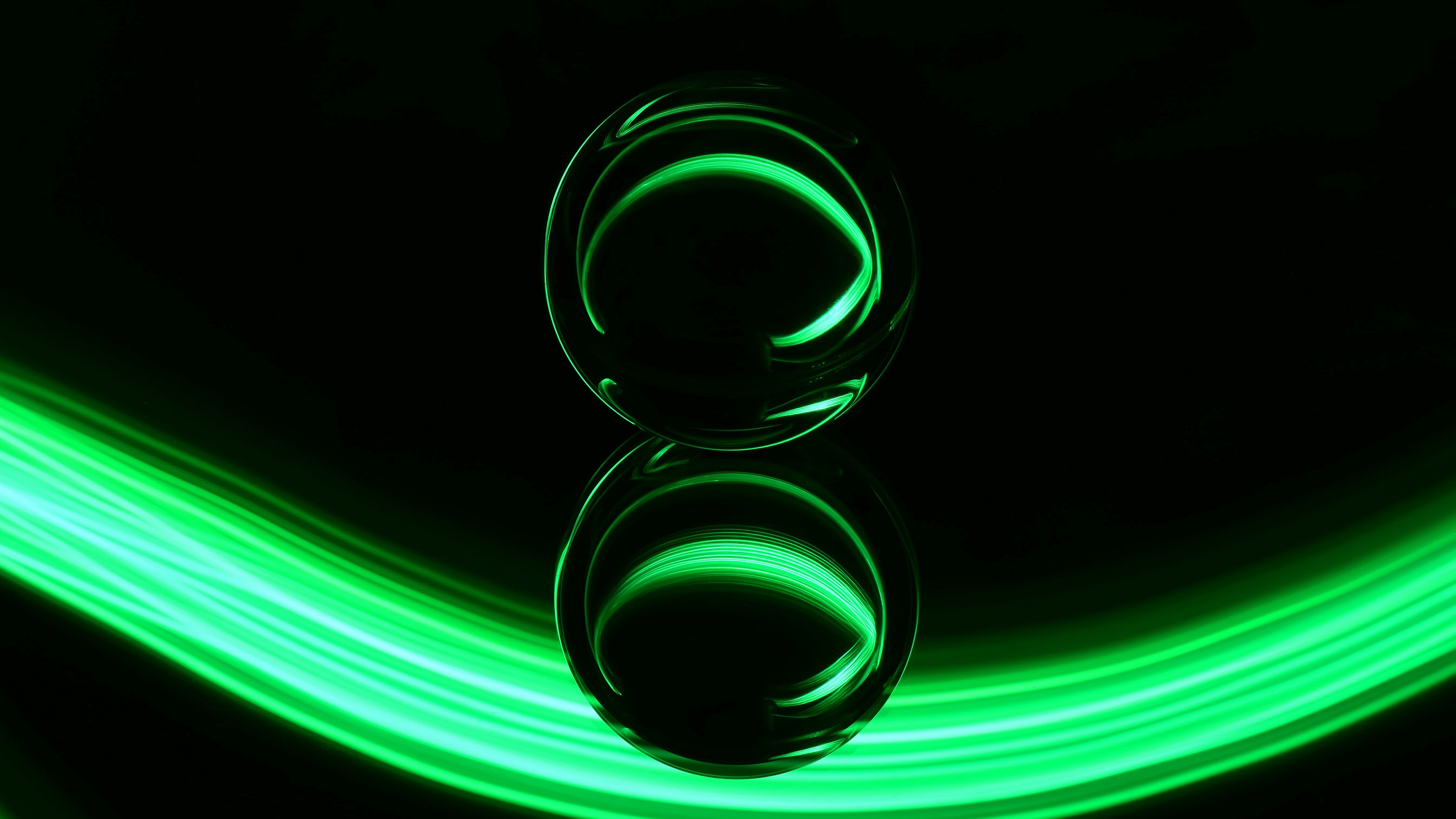Description: A green light reflecting off of a black surface with a reflection of a light on it's surface.