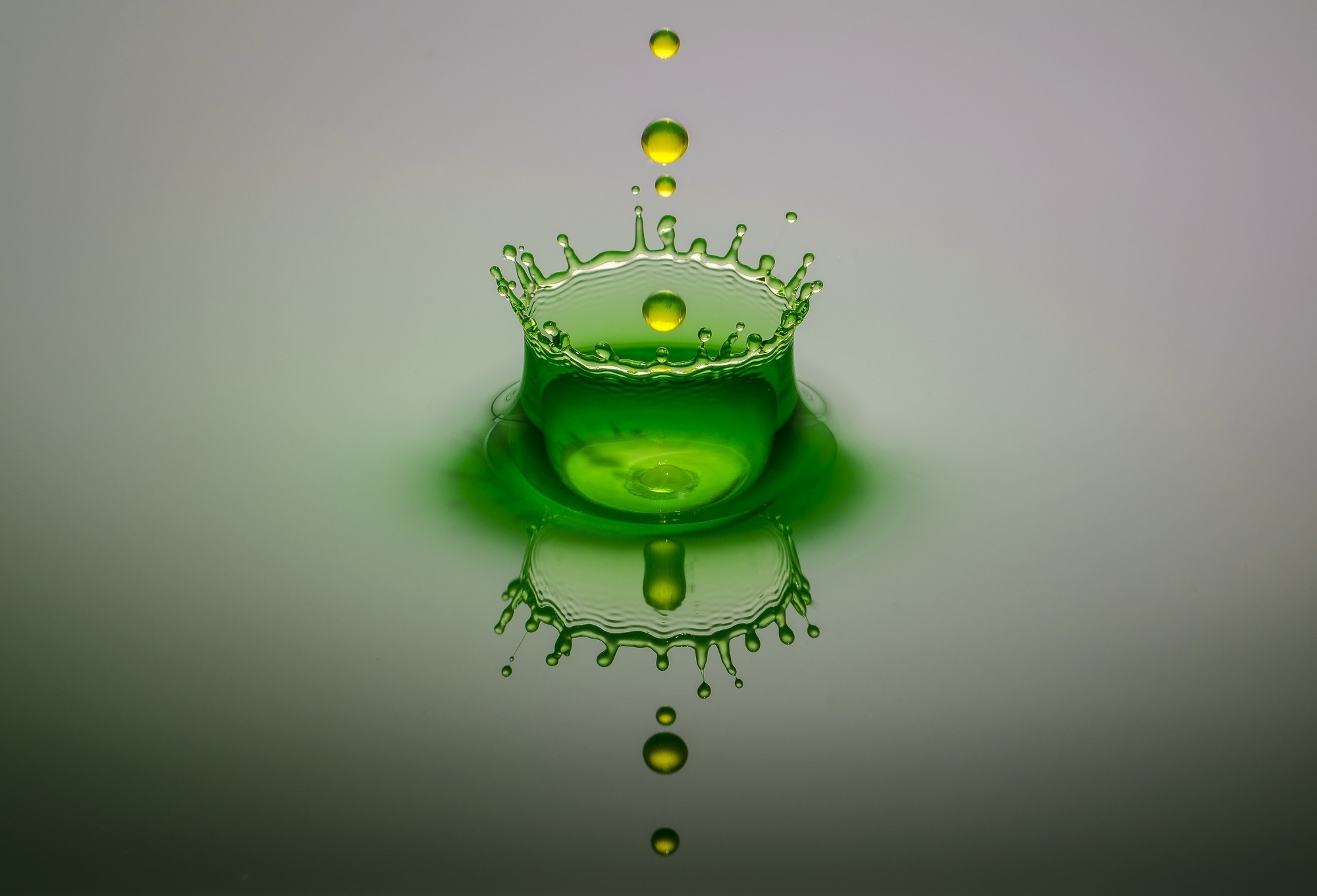 Description: A green liquid splashing into a glass with a crown on top of it.