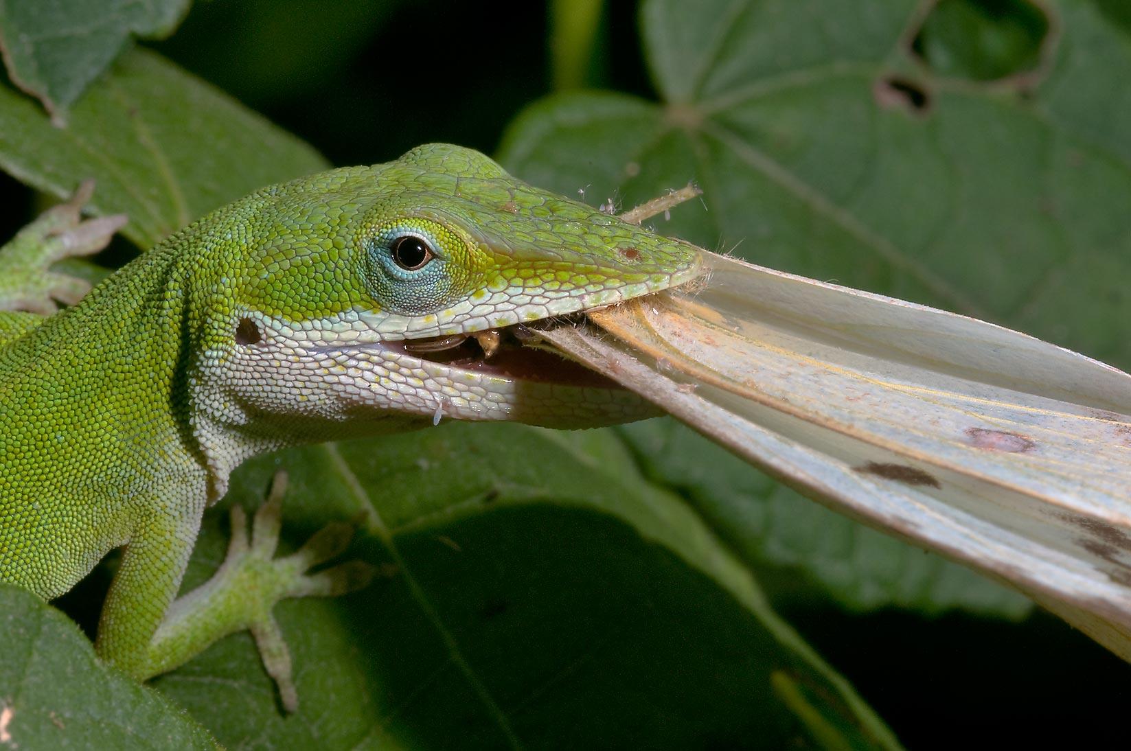 Description: A green lizard is eating a leaf on a plant with its mouth open and tongue out.