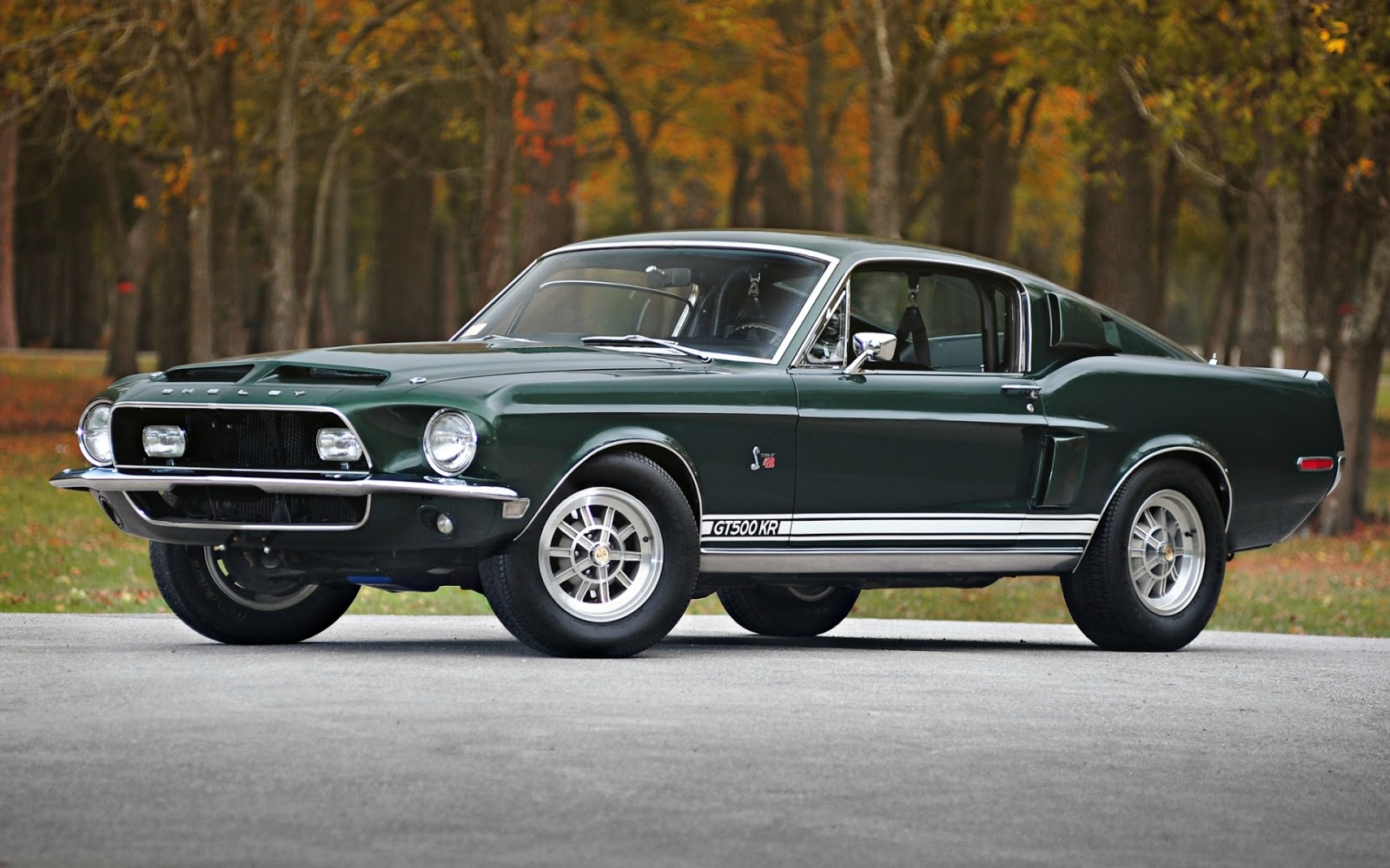 Description: A green mustang mustang sitting on the side of a road in front of trees and grass with fall colors.