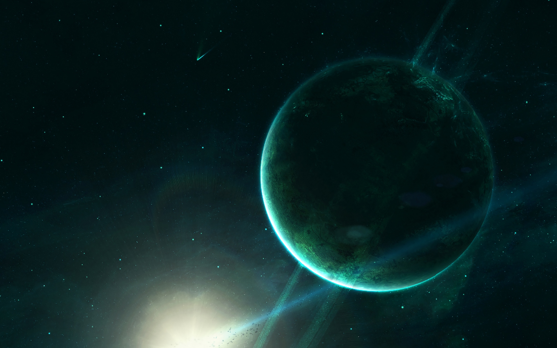 Description: A large green object in the middle of a space with a bright light coming from it's center.