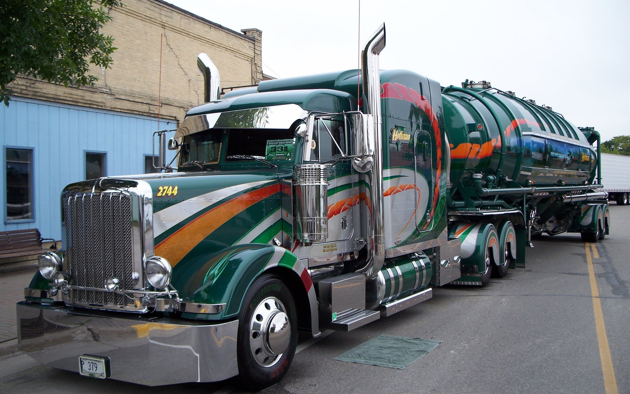 Description: A large green and orange truck driving down a street next to a building and a tree in front of it.
