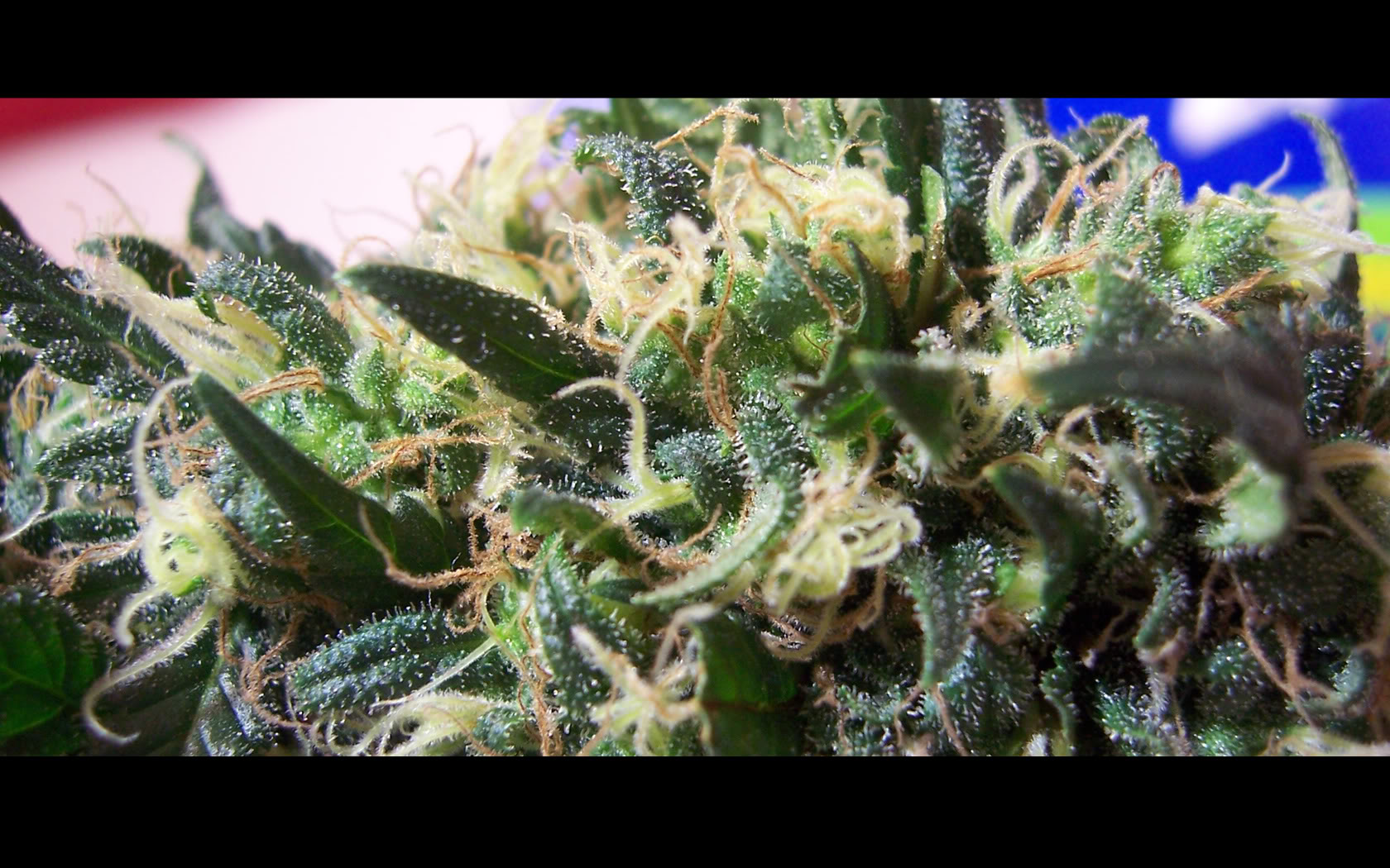 Description: A close up of a green plant with white and yellow leaves on it's surface and a red and blue background.
