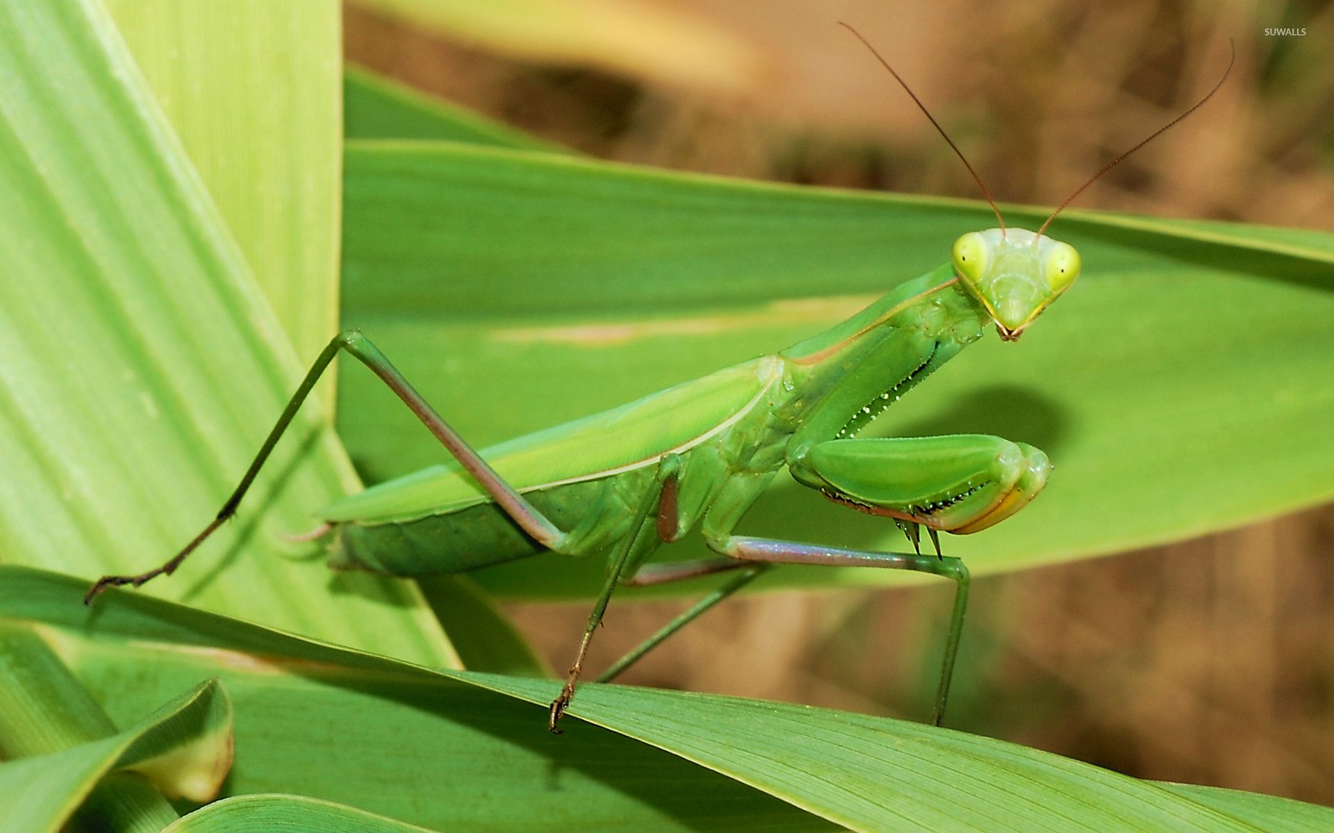 Description: A green praying mantissa sitting on a leafy plant in the sun light of the day.
