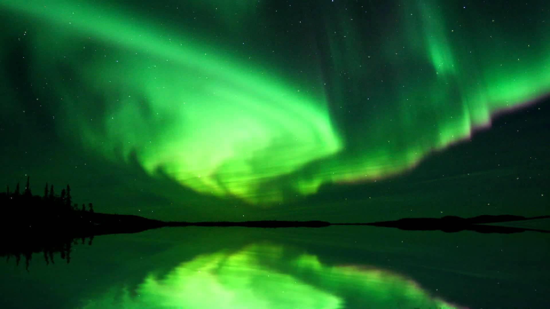 Description: A green and purple aurora bore over a lake with trees in the background and a reflection in the water.