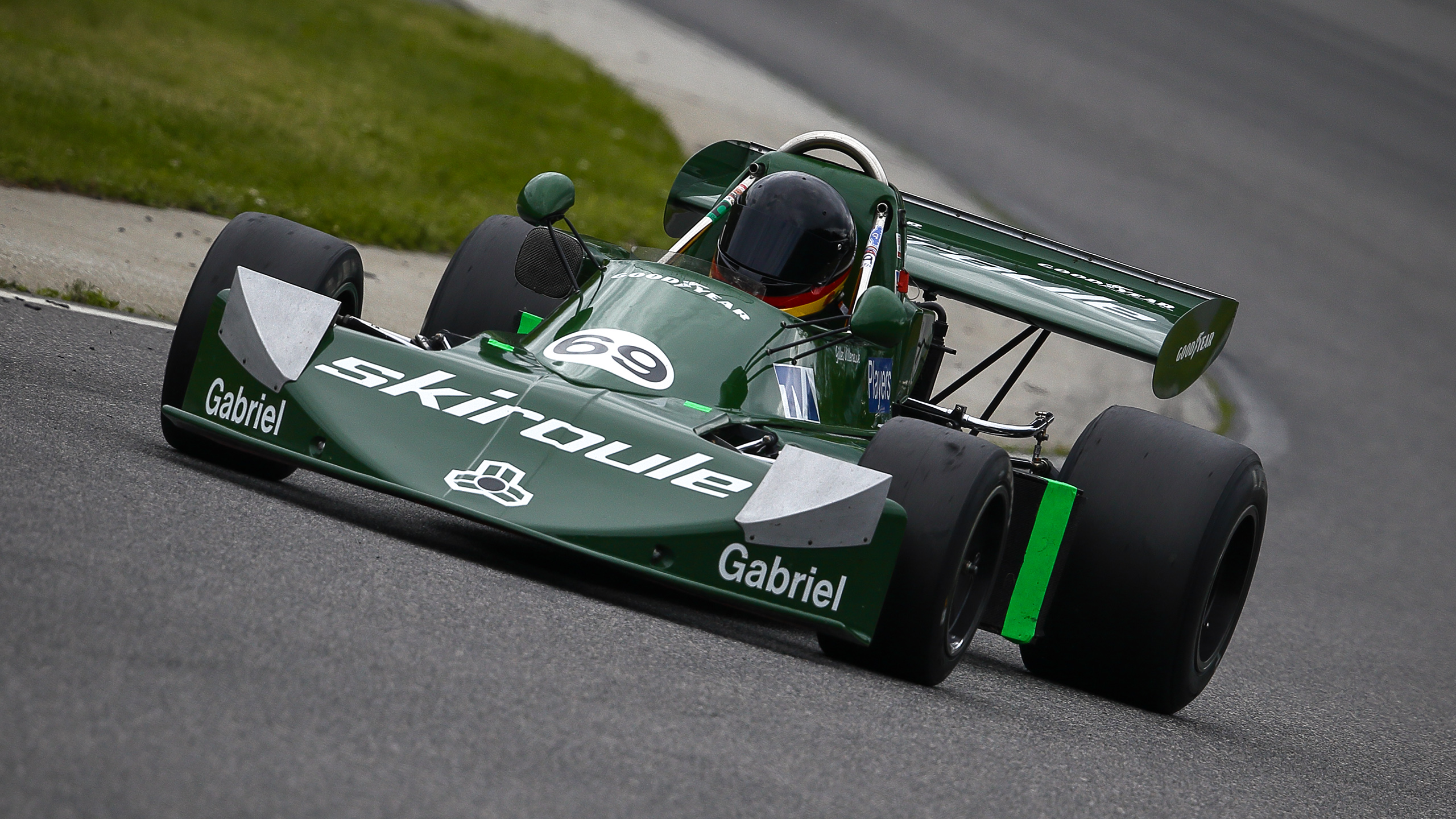 Description: A green race car driving down a race track with grass in the background and a person in the front seat.