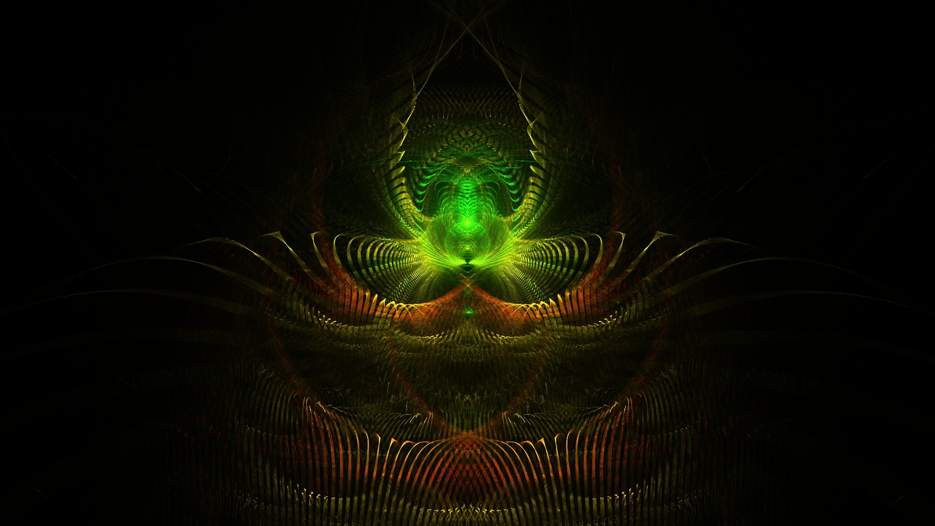 Description: A green and red abstract design with a black background and a green and red flower in the center of the image.