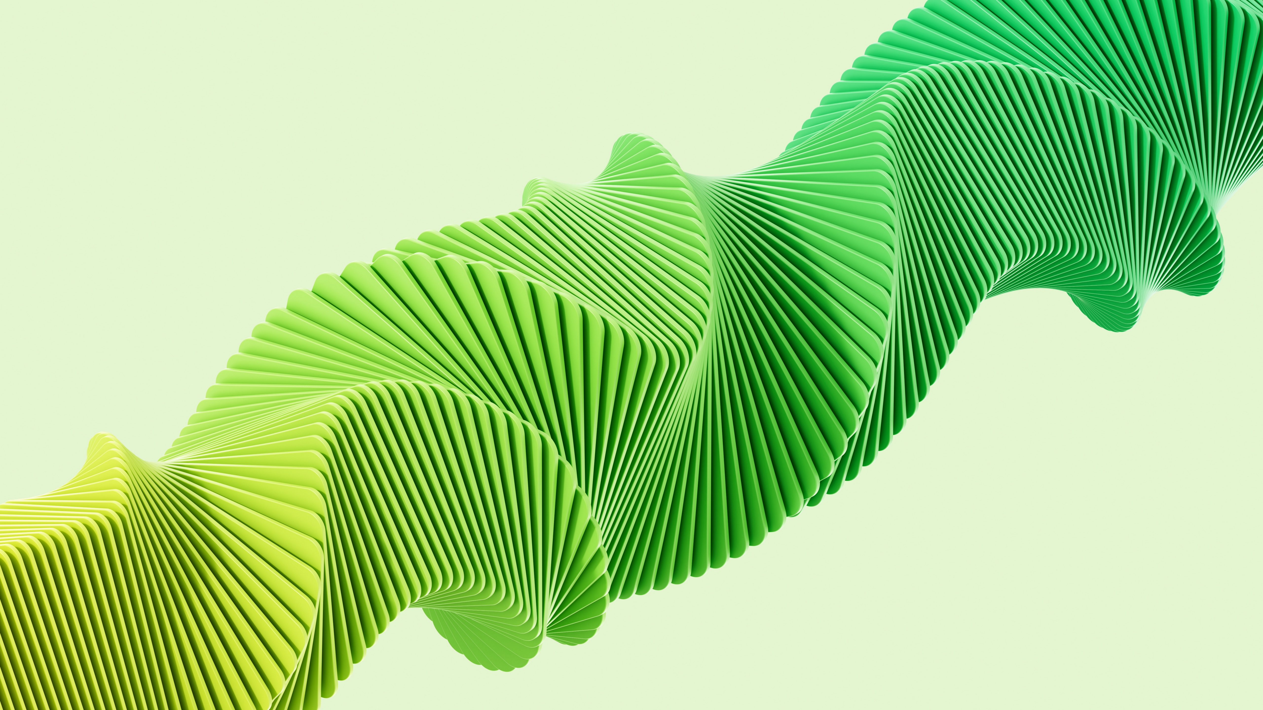 Description: A green sculpture is shown in the air with a white background behind it and a light green background behind it.