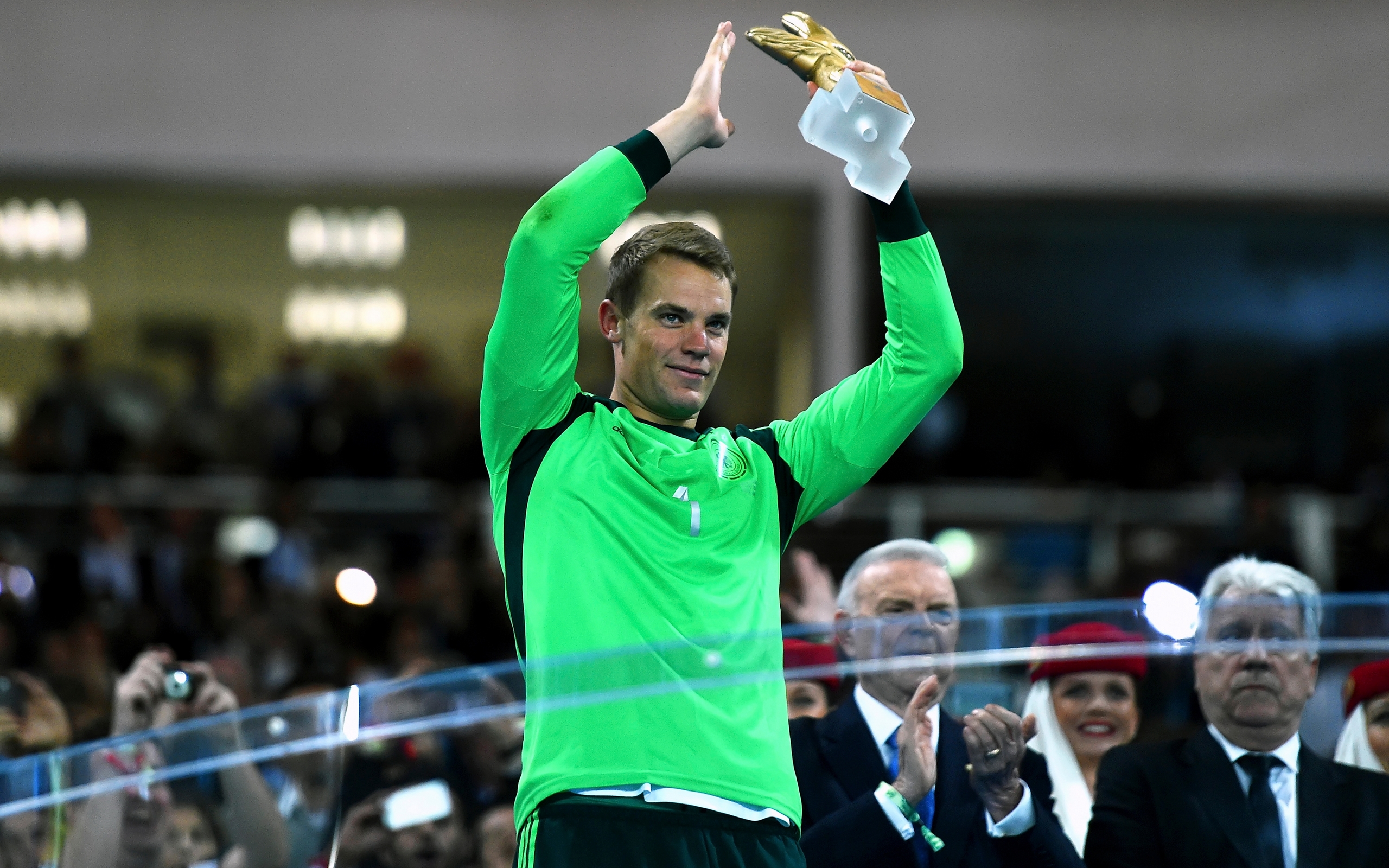 Description: A man in a green shirt holding a tennis racquet in the air with his hands up in the air.