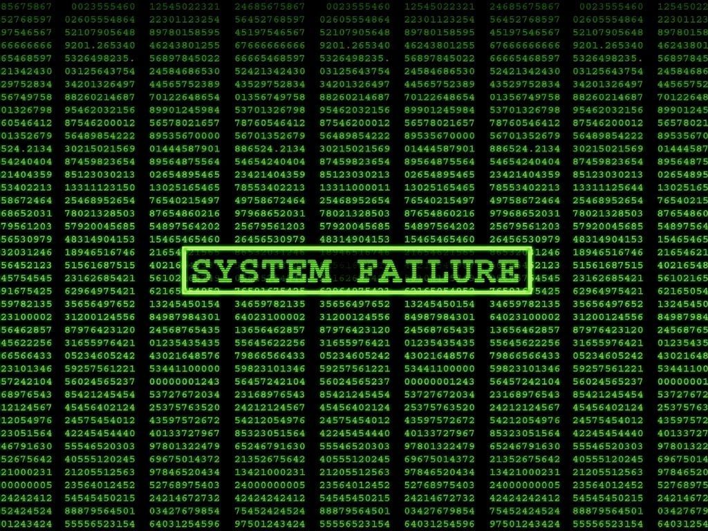 Description: A green sign that says system failure on it's side in front of a black background with green numbers.