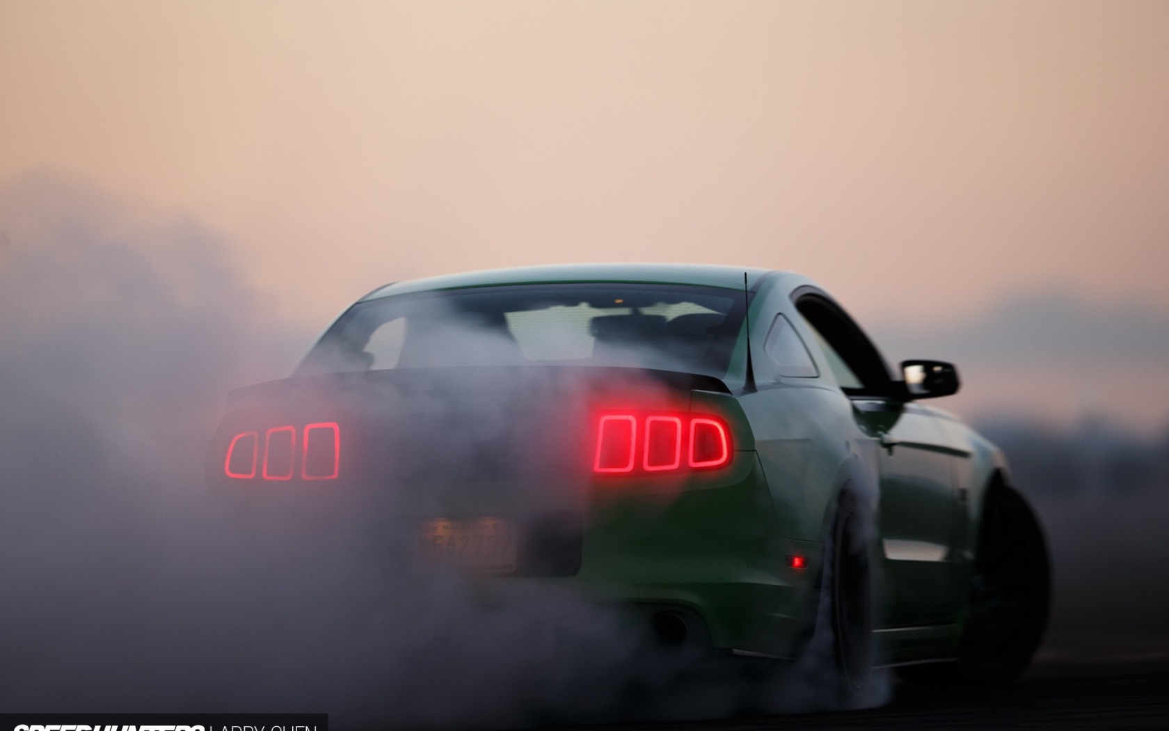 Description: A green car with smoke coming out of it's rear end and tail lights on it's sides.
