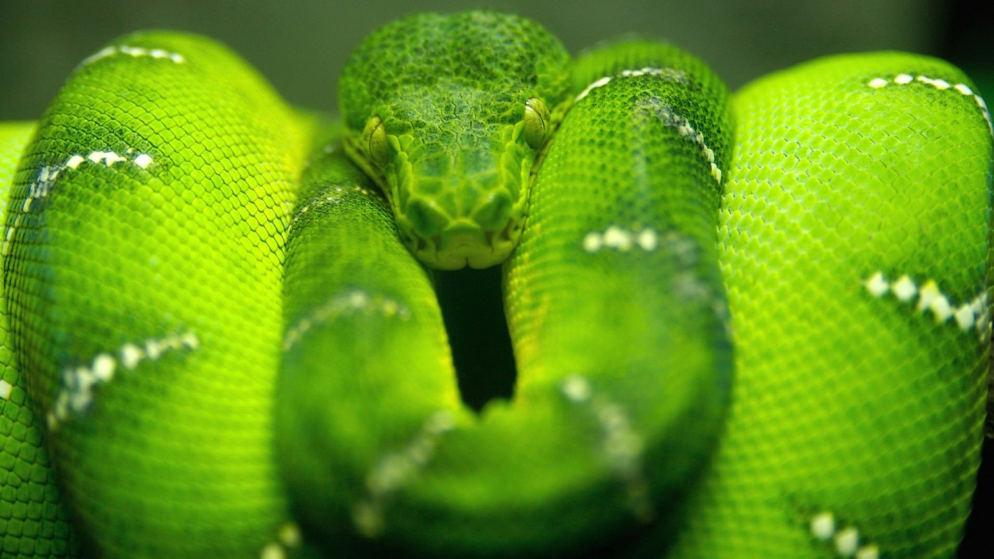 Description: A green snake is curled up in a circle on a black background with white dots on its head and neck.