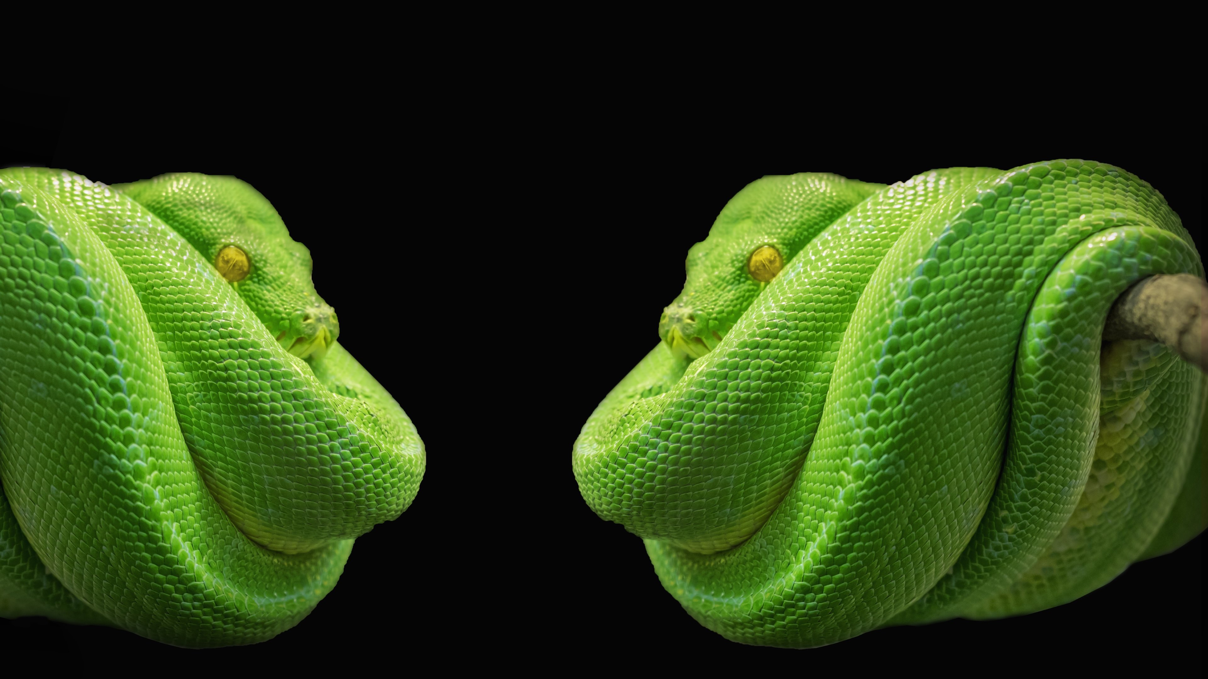 Description: A green snake wrapped in a rope on a black background with a black background behind it and a black background behind it.